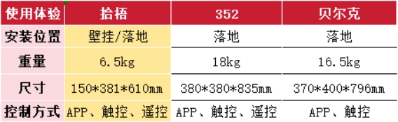 在使用体验上,拾梧FW01依旧保持领先。其机身重量仅6.5kg,远轻于352 X88C的18kg和贝尔克D9L Pro的16.5kg,搬动和安装都更轻松。独特的壁挂、落地双模式设计,让它既能节省地面空间,又能贴合烟雾上升路径,净化效率更高。操作方面支持APP、触控和遥控三种方式,远程调节更灵活。而352虽有类似的操作模式,但体积过大,占地明显;贝尔克虽支持APP与触控,但缺少遥控,灵活性不足。