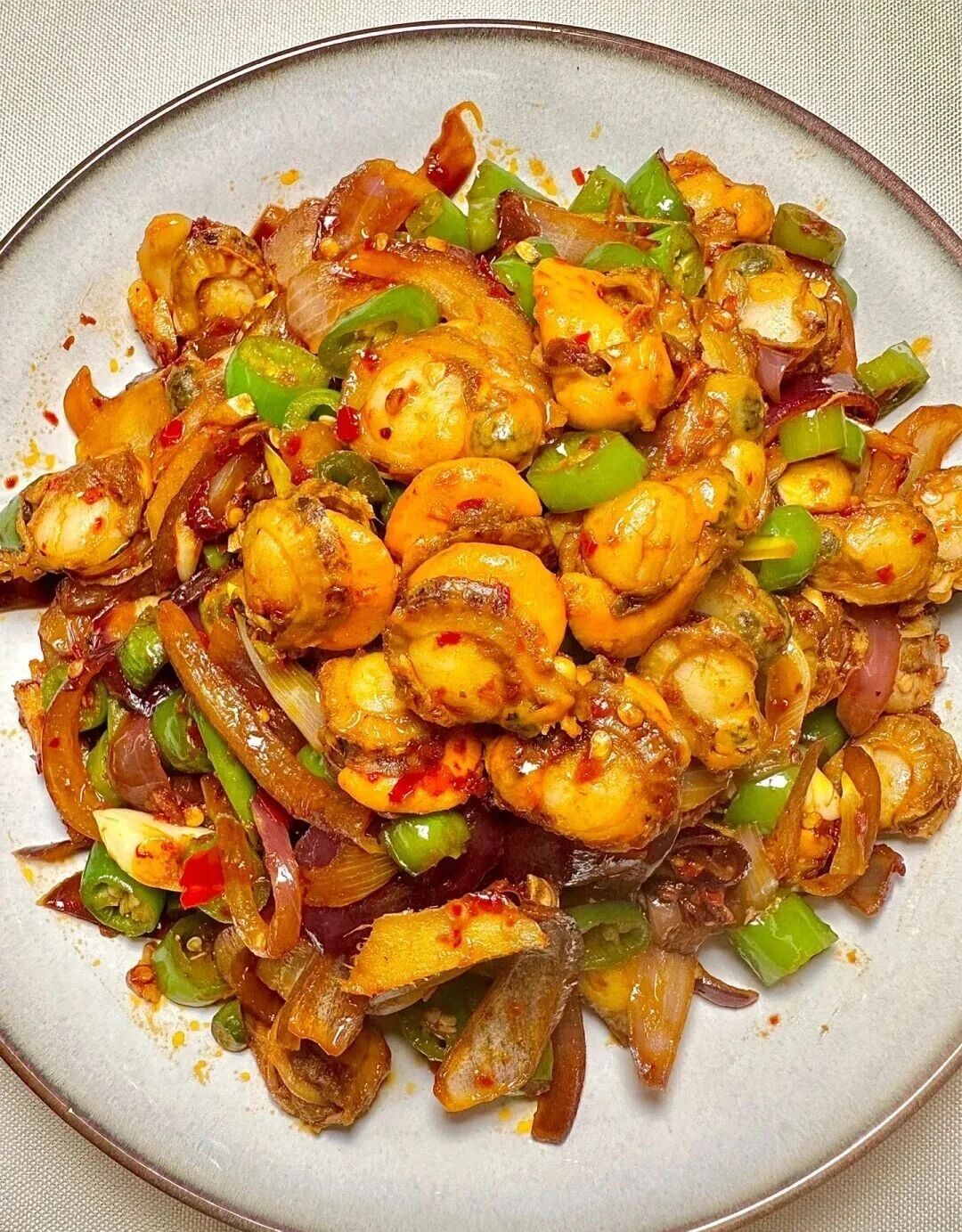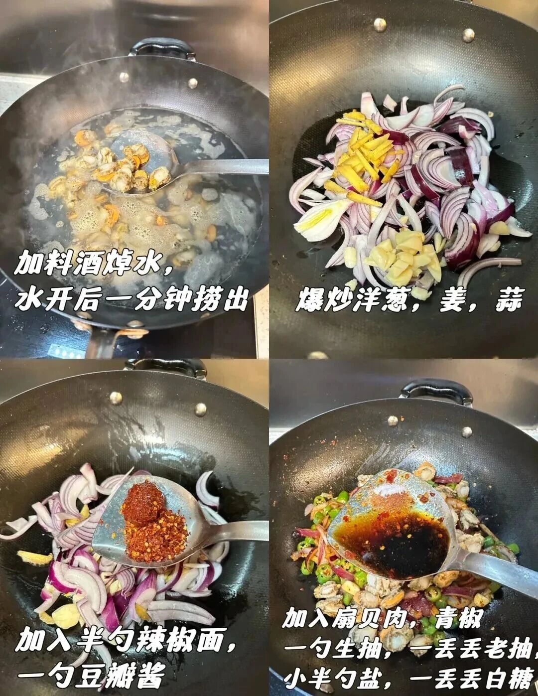 扇贝肉、洋葱、青椒、蒜、姜、料酒、辣椒面、豆瓣酱、生抽、老抽、盐、白糖、胡椒粉、食用油