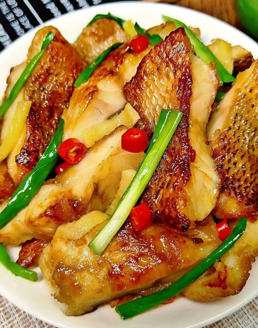 2. 热锅少油小火煎鱼至金黄,放姜丝、小米椒炒香。