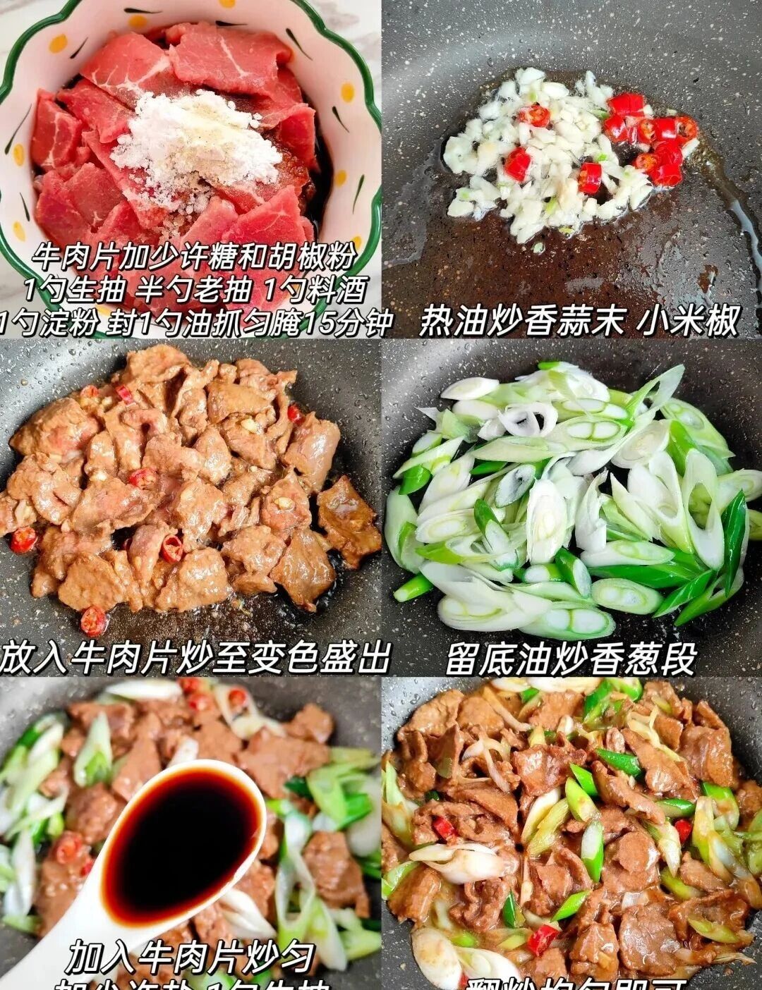 3. 底油炒香葱段,倒回牛肉,加少许盐、1勺生抽炒匀即可。