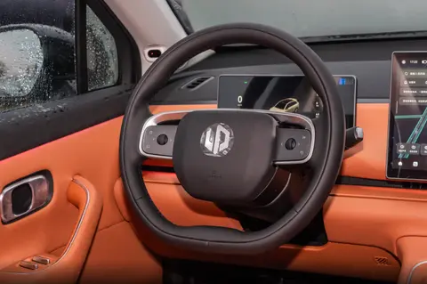 进入车内,内饰设计呈现温馨与科技并存的风格。整体设计简洁,横向延伸的软质搪塑饰板触感上佳,搭配哑光金属装饰条和细腻缝线工艺,质感上乘,无任何廉价感,营造出宛如家中温馨环境般的舒适氛围。方向盘采用双辐设计,皮质包裹手感扎实,配合合理的实体按钮布局,驾驶过程中无需频繁目光转移,也能方便操作定速巡航、语音唤醒等功能,提升驾驶关注度和安全。可谓是既贴心又易用的智能助手。