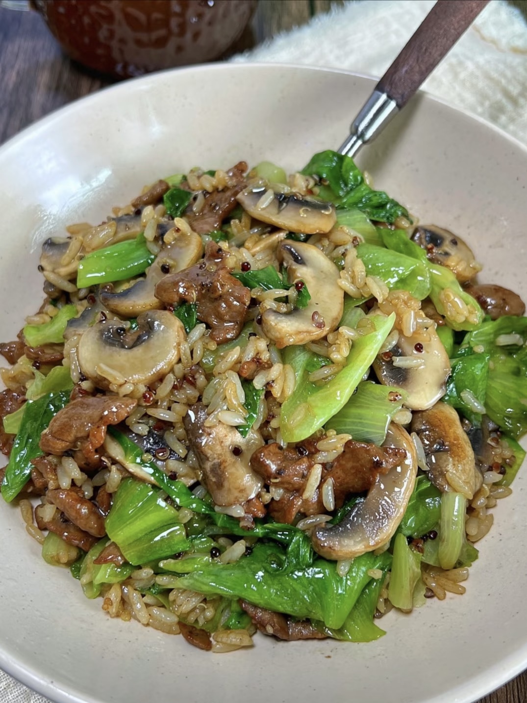 看!出锅啦!深褐色的牛肉裹着亮晶晶的芡汁,口蘑金黄肥厚,翠绿的生菜若隐若现,所有的鲜香都被那薄芡锁住,妥妥地铺在热气腾腾的白米饭上。一勺挖下去,米饭吸饱了汤汁,牛肉嫩滑,口蘑鲜美,生菜爽脆,几种口感在嘴里演奏出和谐的乐章。这哪是一盘菜?这分明是忙碌一天后,对自己最实在、最温暖的犒赏。
