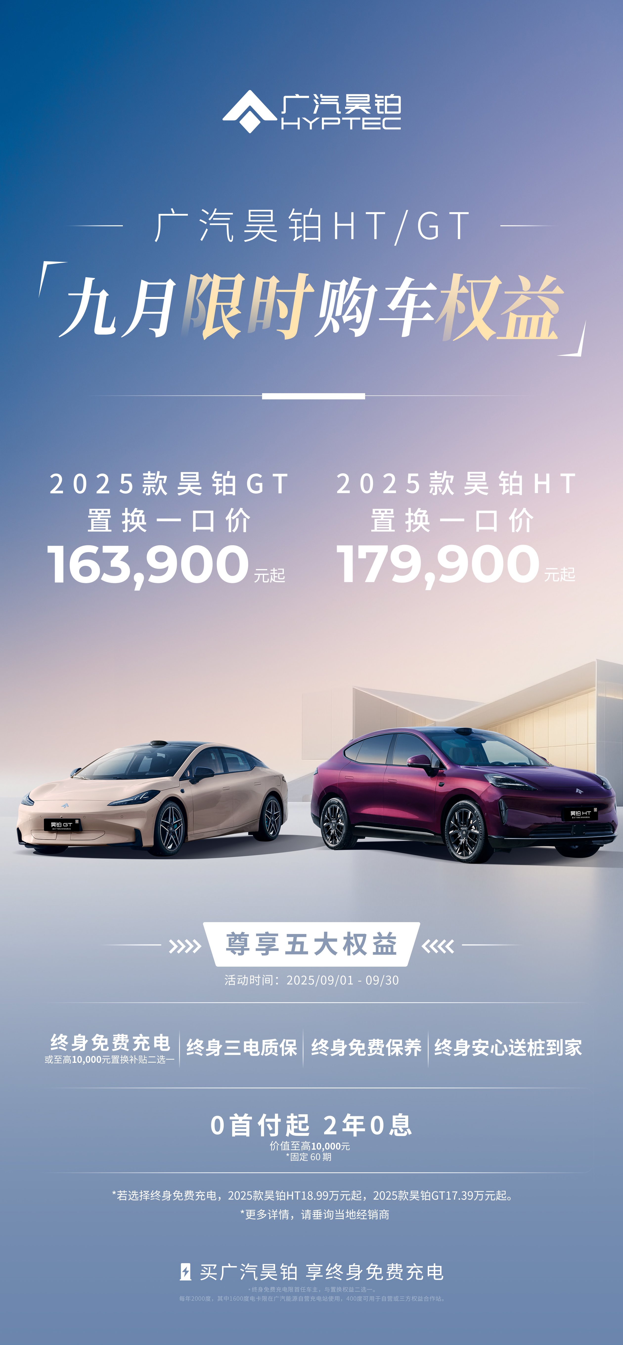 9月限时活动中,下定即可参与100%中奖的抽奖活动,最高可获得5999元购车补贴。结合"0首付起、2年0息"的金融政策,显著降低了购车门槛。再加上终身三电质保、免费保养、终身安心送桩到家权益,让昊铂HT的长期使用成本更具优势。