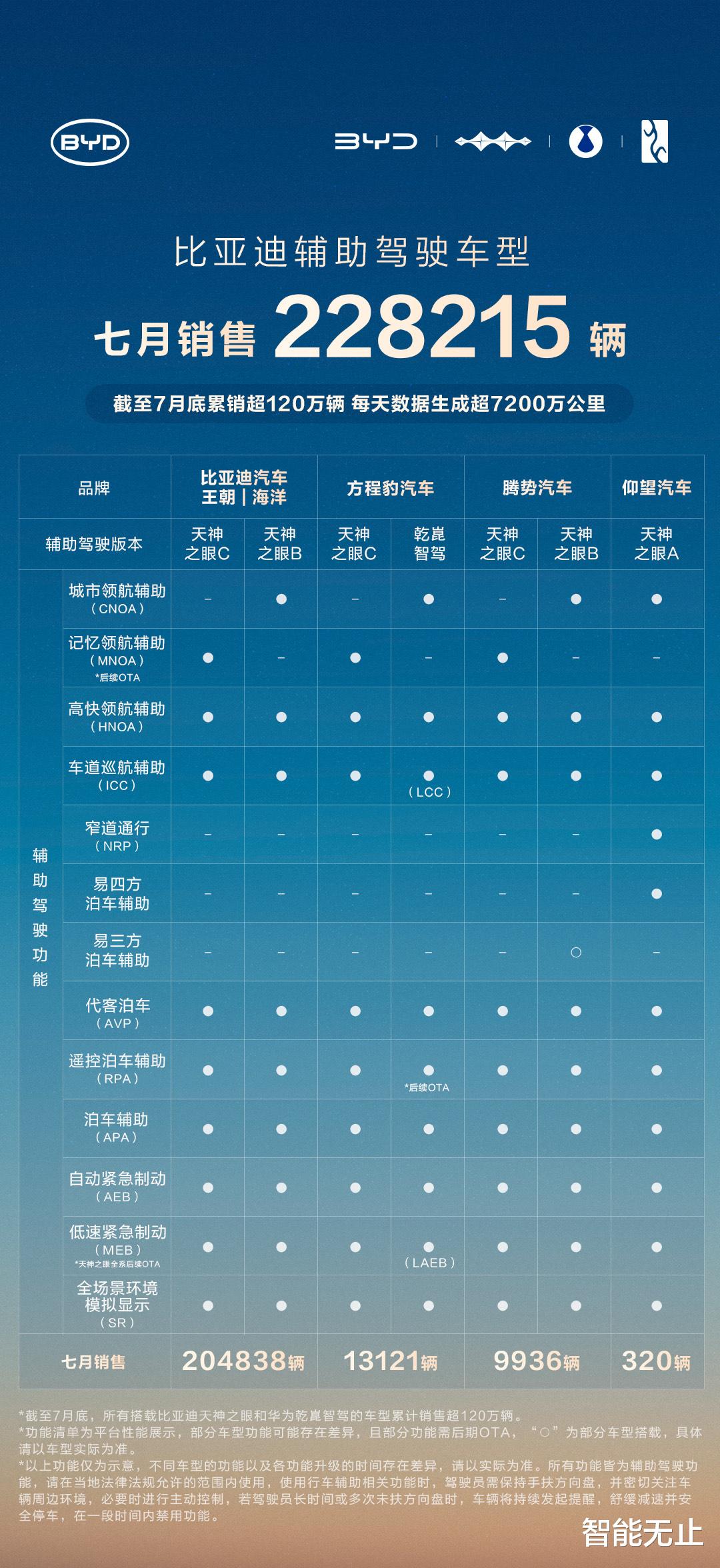 智驾还是得看比亚迪!早在今年二月初,比亚迪开启了重磅的"全民智驾"战略,在旗下全系车型中普及高阶智驾功能。如今已经过去了半年的时间,比亚迪在这块可谓是取得了非常喜人的成绩,已累计交付超120万辆搭载天神之眼辅助驾驶系统的车型,“天神之眼”一举成为了中国市场装车量最大的智能辅助驾驶系统,不得不说标志着中国智能驾驶技术迈入大规模普及新阶段。曾几何时,高阶智驾是高价位车型的“代名词”。比亚迪作为新能源的引领者,一直坚持“科技惠普”理念,通过技术创新等,在旗下各个价位的车型的中普及智驾功能,涵盖几万、十几万及以上价位车型,在主流价格区间形成技术碾压优势。此前,比亚迪已经推送了天神之眼史上最大规模智驾OTA,涉及旗下四大品牌,全面覆盖泊车、行车、安全三大板块十余项功能,带来了史诗级智驾体验。安全是最大的豪华,比亚迪坚持以安全为底线推动普及智驾,天神之眼辅助智驾系统拥有领先业界的主动安全能力技术,辅助驾驶可实时监测路况,可以精准的避免潜在的危险。在紧急情况下,辅助驾驶能瞬间作出判断,避免事故发生,助力我们安全出行。更让人赞不绝口的是,比亚迪率先实现媲美L4级智能泊车并承诺为智能泊车安全兜底。这体现了其深厚的技术实力以及对用户负责到底的决心。不得不说比亚迪在智驾领域实现了各项领先,例如技术水平、装车量、安全性能等等。凭借超120万台辅助驾驶车型保有量,每天可生成辅助驾驶数据超7200万公里,达成行业最大的辅助驾驶数据底座,为智驾体验的不断优化提供了坚实支撑,巩固其在智驾的领先地位。反正怎么说呢?超百万用户选择天神之眼,比亚迪在智能驾驶领域堪称行业领头羊!