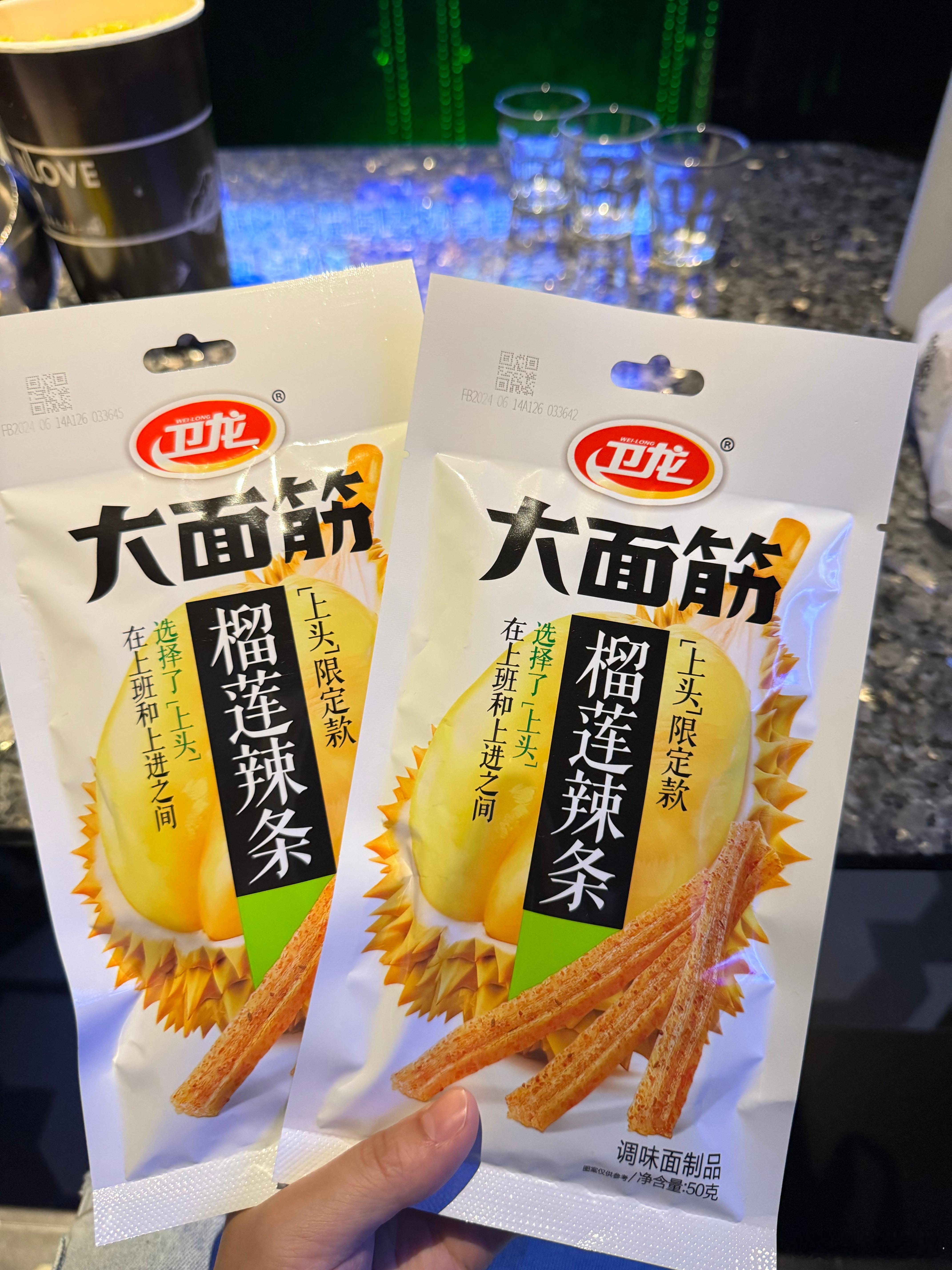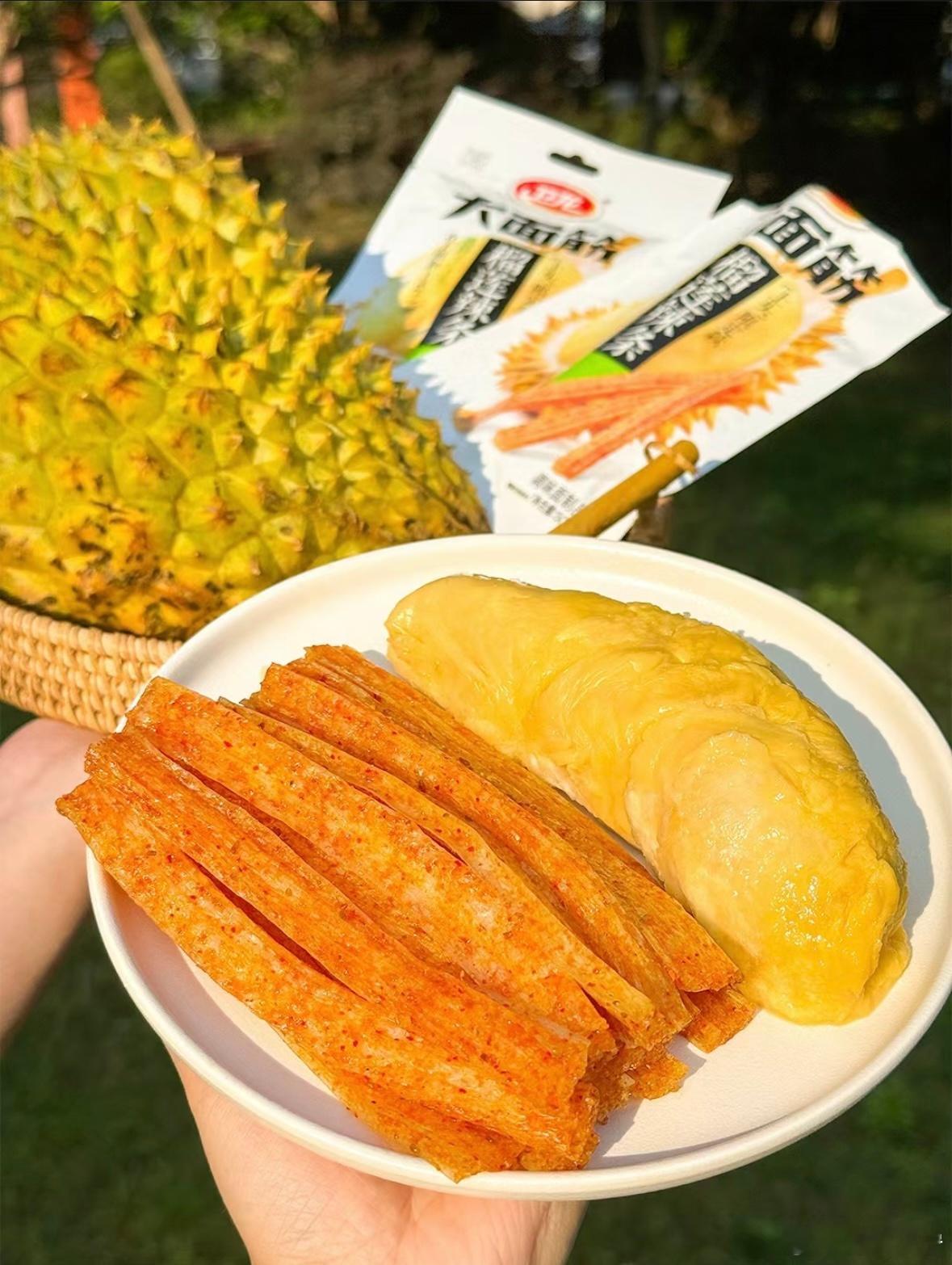 #谁研发的榴莲辣条#早上吃鸡蛋灌饼就超级喜欢加辣条,这一次哈竟然有了榴莲味的[