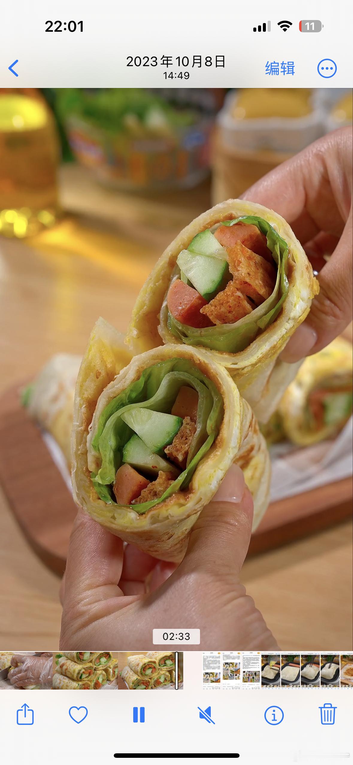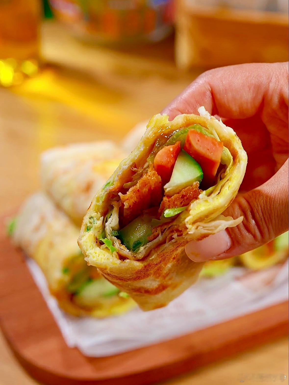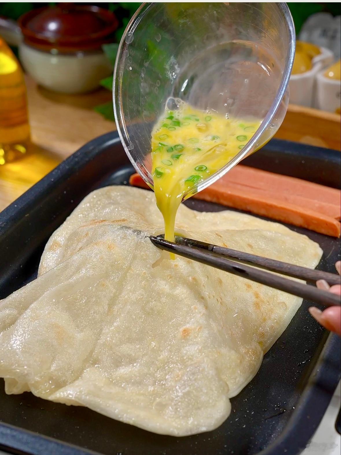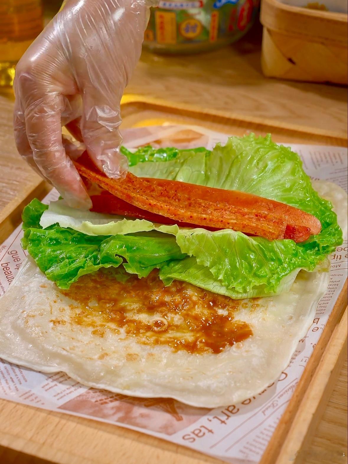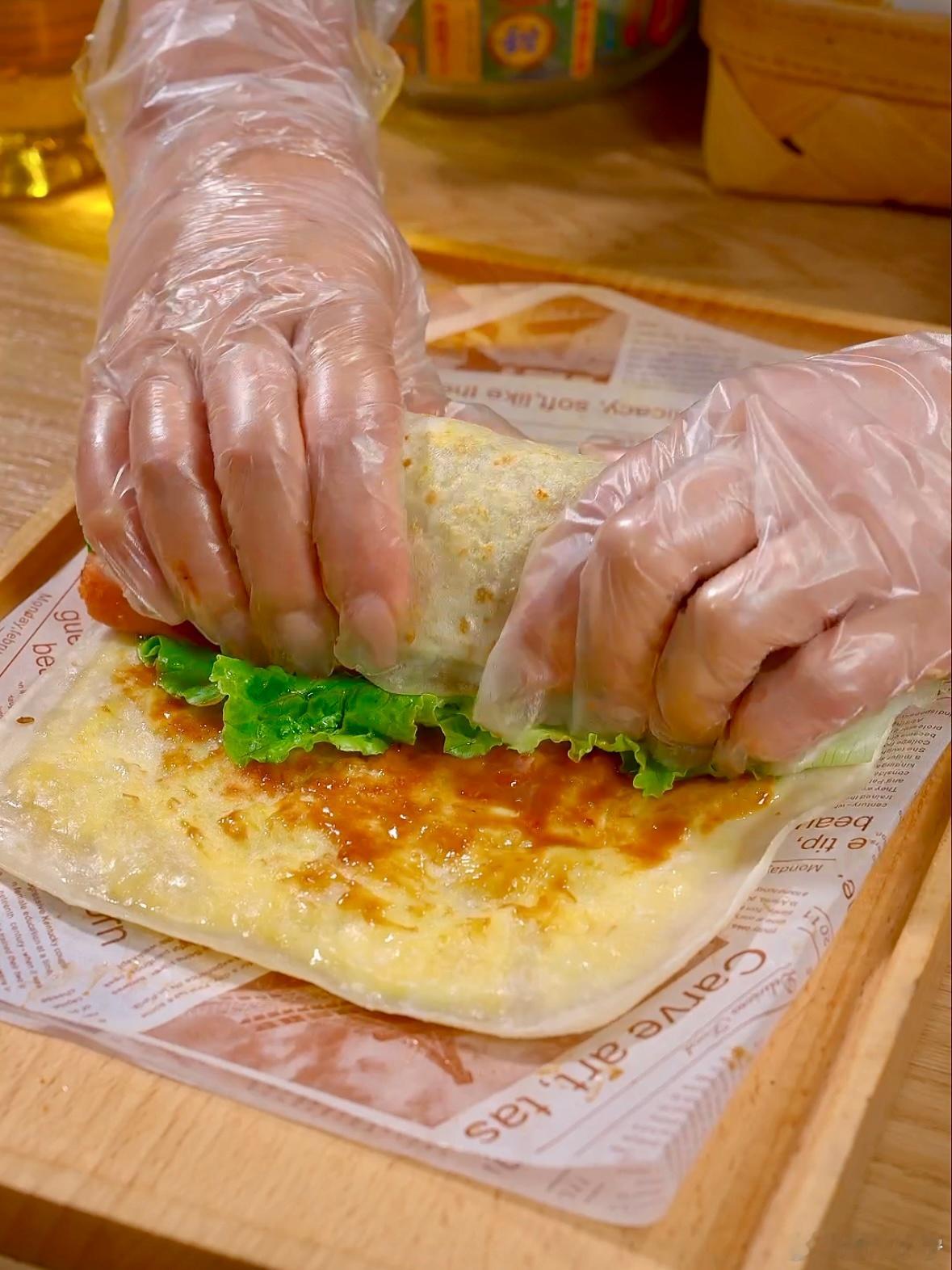 自己在家DIY也简单,现成的鸡蛋灌饼皮,鼓起来就灌鸡蛋,煎到两面金黄,刷酱,再放上火腿肠生菜黄瓜条榴莲辣条。卷起来开吃,一口下去,榴莲的香搭配辣还有卫龙的嚼劲。妈呀!好好吃,快冲!