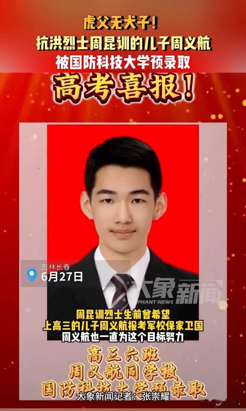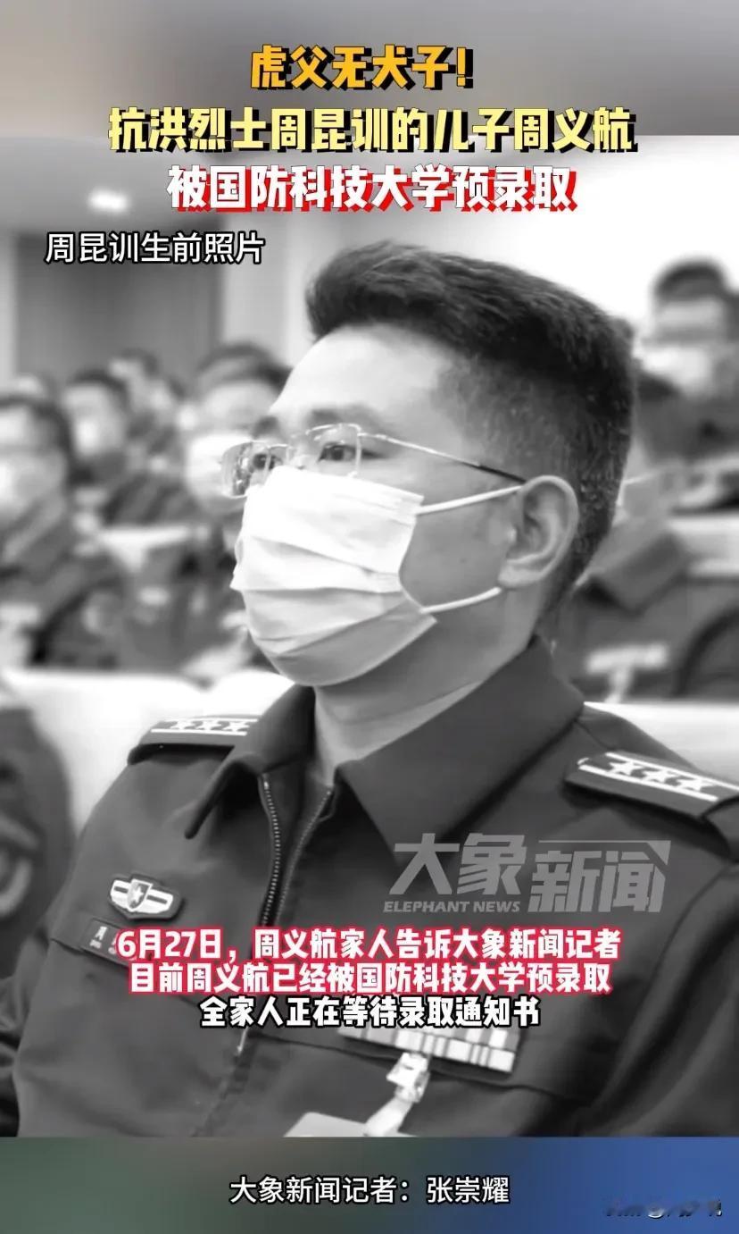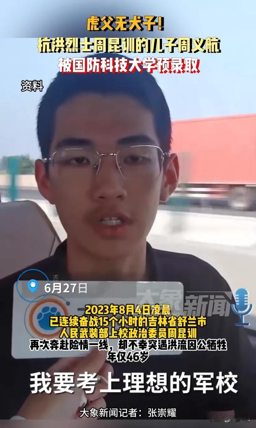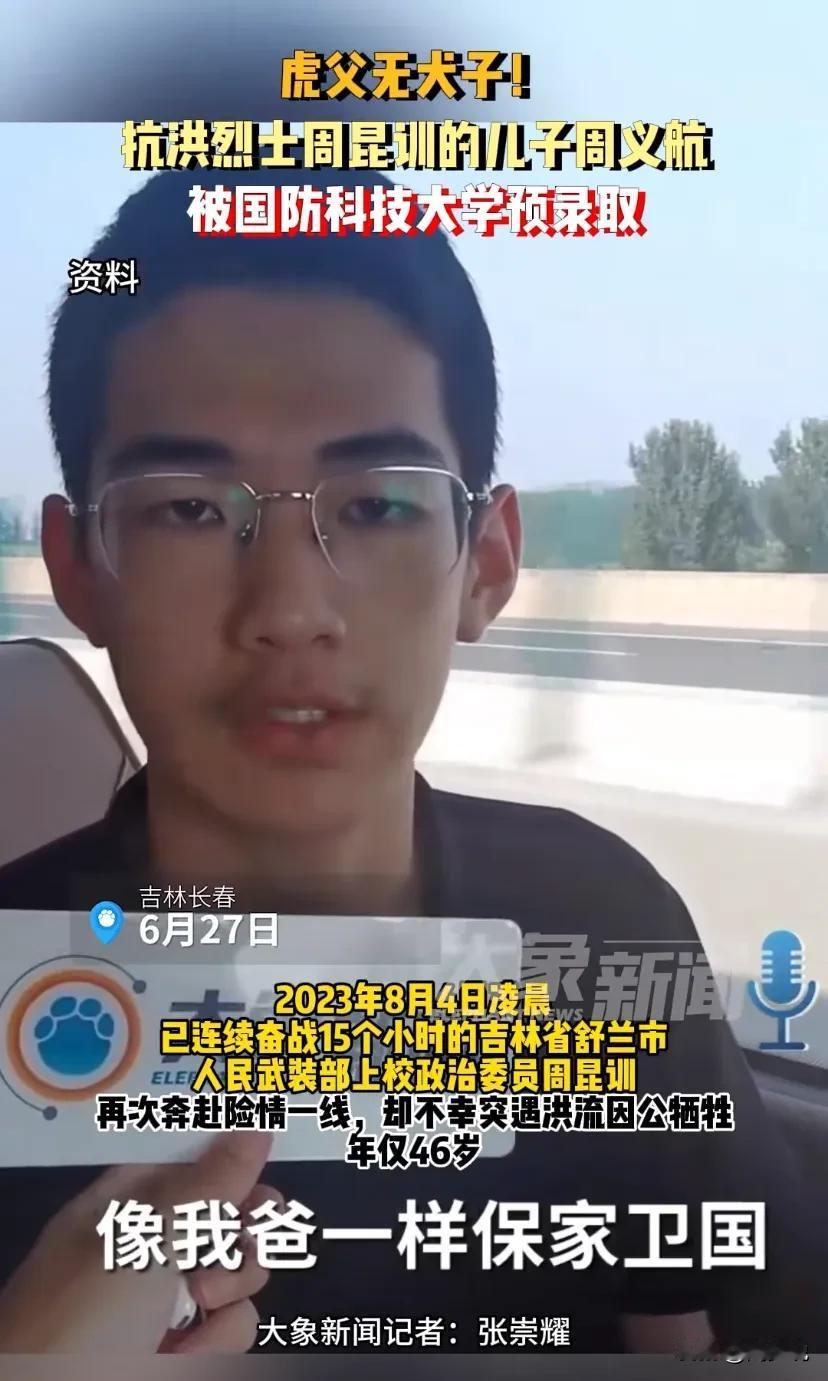 “虎父无犬子!”吉林长春,抗洪烈士周昆训的儿子周义航被国防科技大学预录取。对于报考国防科技大学,周义航说:“我要考上理想的军校,像我爸一样保家卫国!” 此视频曝光之后,引起众多网友议论纷纷。有网友当即表示,保送国防科技大学,我也不忌妒,这是英雄的孩子应该得到的。烈士家属子女就应该破格录取,或者有特殊政策,毕竟他们父母,用生命捍卫了国家的大好河山。 还有网友则认为,普通孩子考上国防科技大学,是能力,是光宗耀祖。周义航上国防科大,是继承父亲遗志。作为母亲,面对丈夫牺牲,把独子上交国家,或许真的思想斗争过,真的是有大情怀大格局的女人。 有一说一,从周义航的话语中,可以看出来,真是虎父无犬子,内心秉承着父亲的教诲,以父亲为榜样,报考军校,保家卫国。说句真心话,周少被国防科技大学录取,真是一点也不嫉妒,就这样的烈士子女,就应该被照顾。希望周义航不忘初心,将来目标梦想成真。 对于周义航说报考军校报效祖国,你们被感动到了吗?(图:大象新闻)