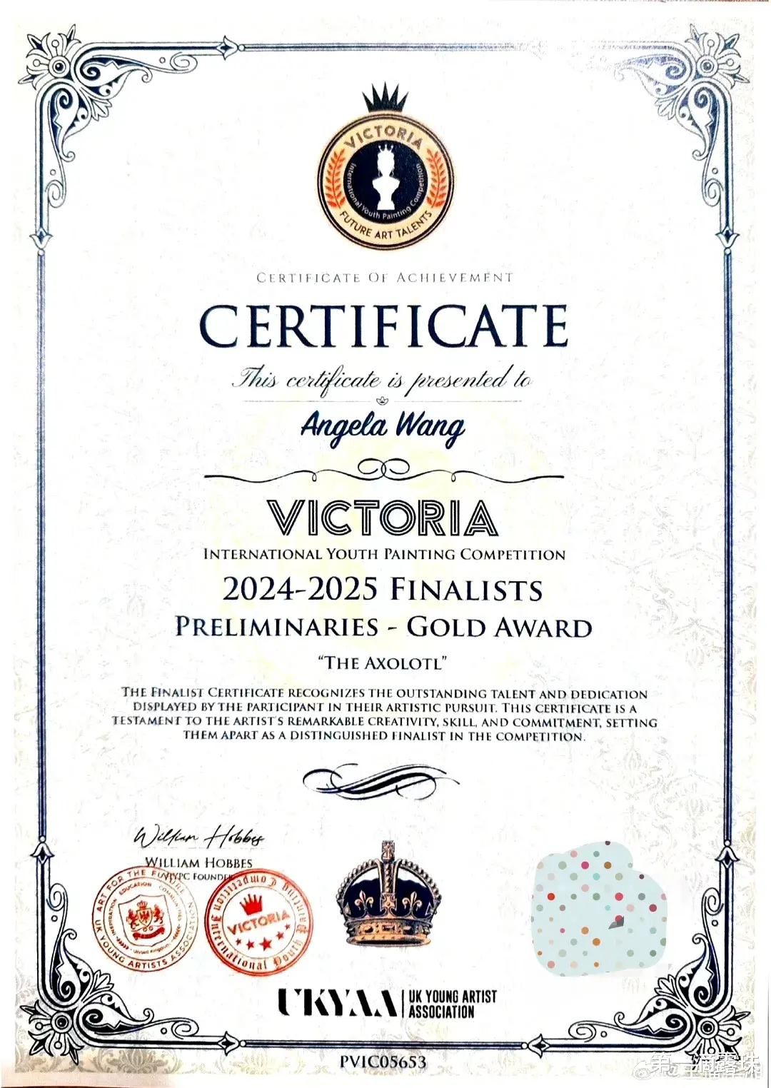 王诗龄凭借绘画作品《蝾螈》获得英国“维多利亚国际青少年绘画大赛”金奖(最高荣誉),作品以生物皮肤纹理、光影层次精细刻画获评“难辨画与照片”。
