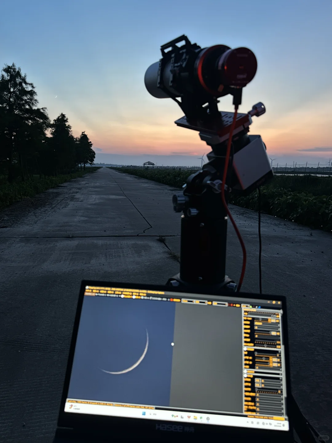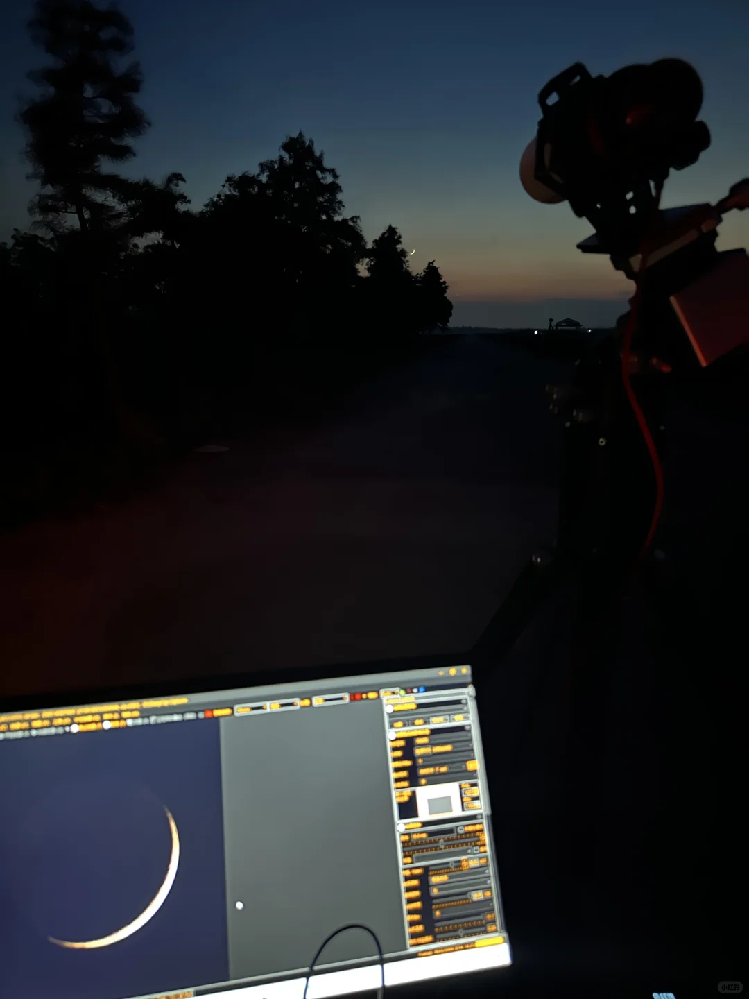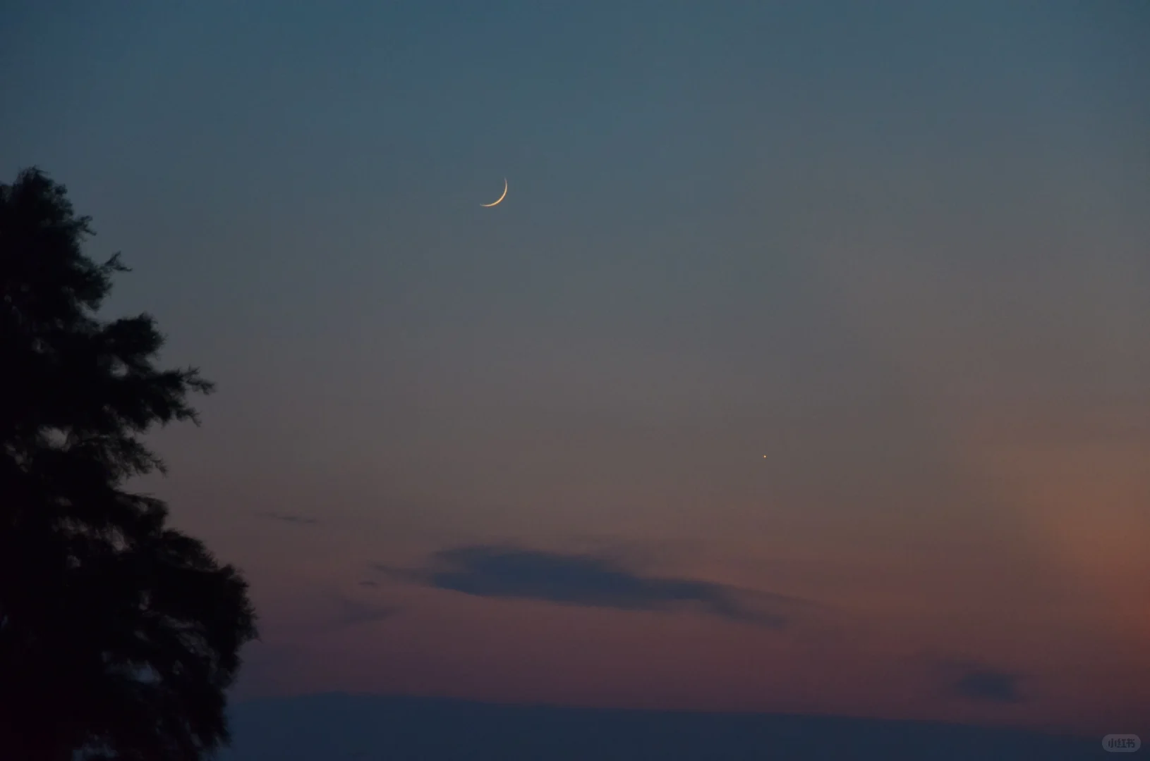 8月6日农历初三日落后的4%峨眉月,月牙非常细,只有日落后才能看见。图2 月亮右下角的亮星是金星,本来左下角还有水星,但是太低了被云覆盖。