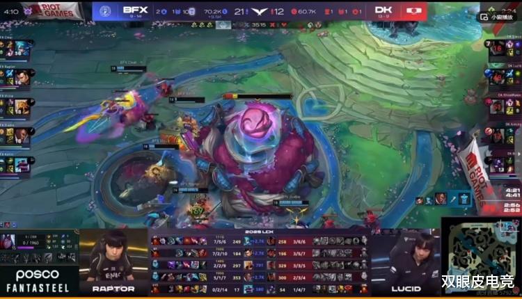 也就是很多人都以为这局DK稳稳拿下的时候,Swioo的朗姆站了出来,先是掉点,然后绕后被抓,在连续死亡两次的情况下,BFX先拿小龙和厄塔汗再推下路塔,经济差慢慢到了2k。在26分钟的时候又是Siwoo的掉点随后DK被逼大龙,随后打出一波1换2,拿下大龙后顺便又拆了DK的中下双二塔,并且经济实现了反超。到了这个时候许哥的瑞兹再怎么C也无济于事了,最主要的是巨魔的柱子给没位移的英雄带来的限制太多,随后31分钟中路团战,BFX一波带走了比赛,2-0完胜DK。