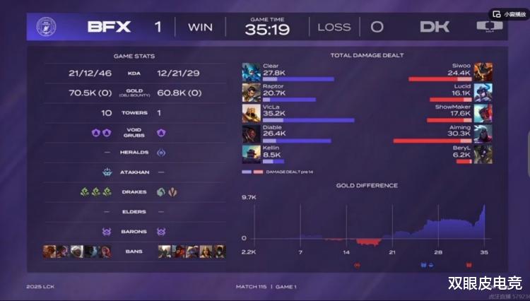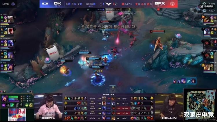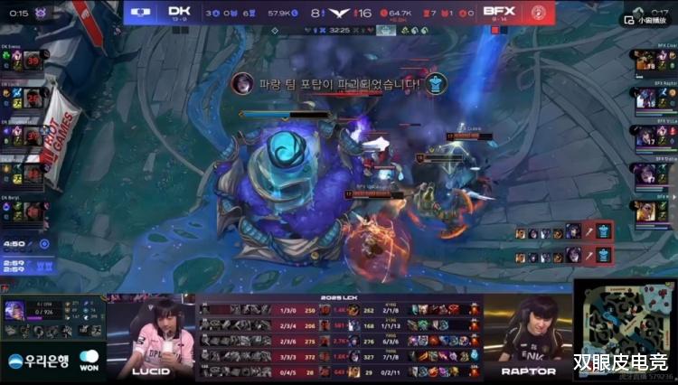 第一局DK就选出了猪刀组合,前期效果非常显著,尤其是在15分钟先锋团的时候,Clear格纹吃了第一波集火没死,但是ShowMaker永恩接上大招随后Siwoo的兰博大招拉满了AOE,BFX根本没做好准备,随后打出一波0-3,经济差也来到了2k多。在控完两条小龙再加上先锋的情况下一直按照好的方向走,但是在24分钟DK又拉了一波大的。