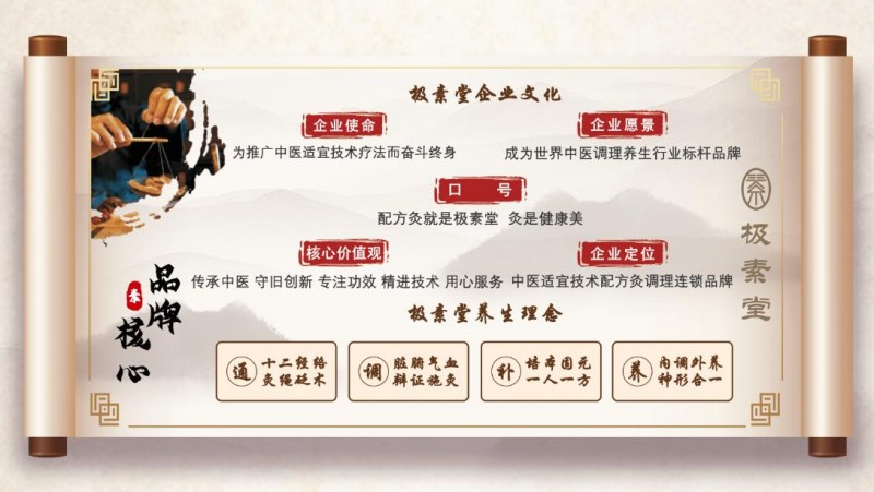 极素堂成立于2016年,一直致力于成为中医文化传承与创新的先锋力量。定位“中医适宜技术配方灸调理连锁品牌”;“为推广中医适宜技术疗法而奋斗终身”的企业使命;“传承中医、守旧创新、专注功效、精进技术、用心服务”核心价值观。