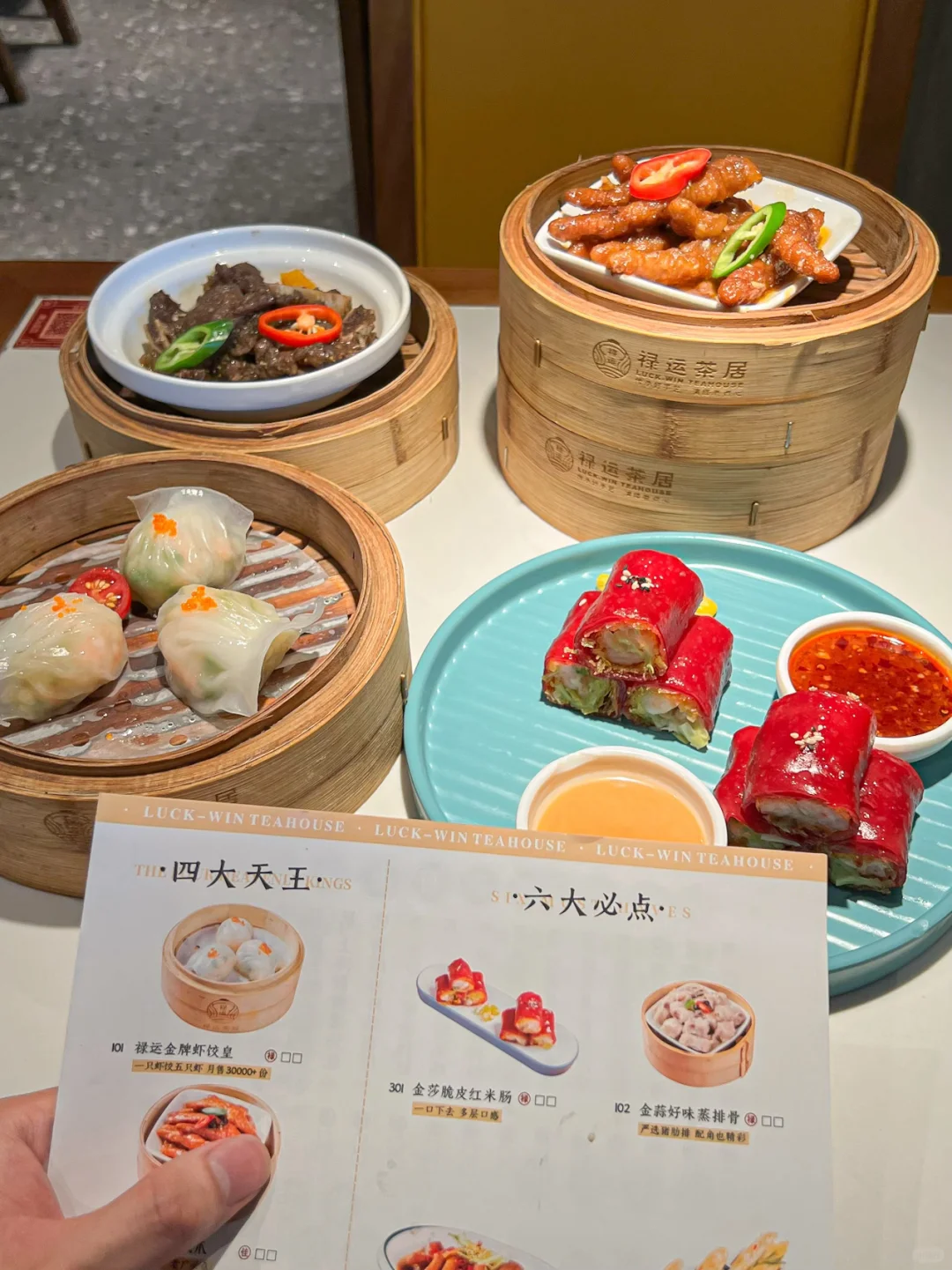 金莎脆皮红米肠、酱皇豉椒蒸凤爪、金蒜好味蒸排骨必点,选座位时候都看到每桌都有上