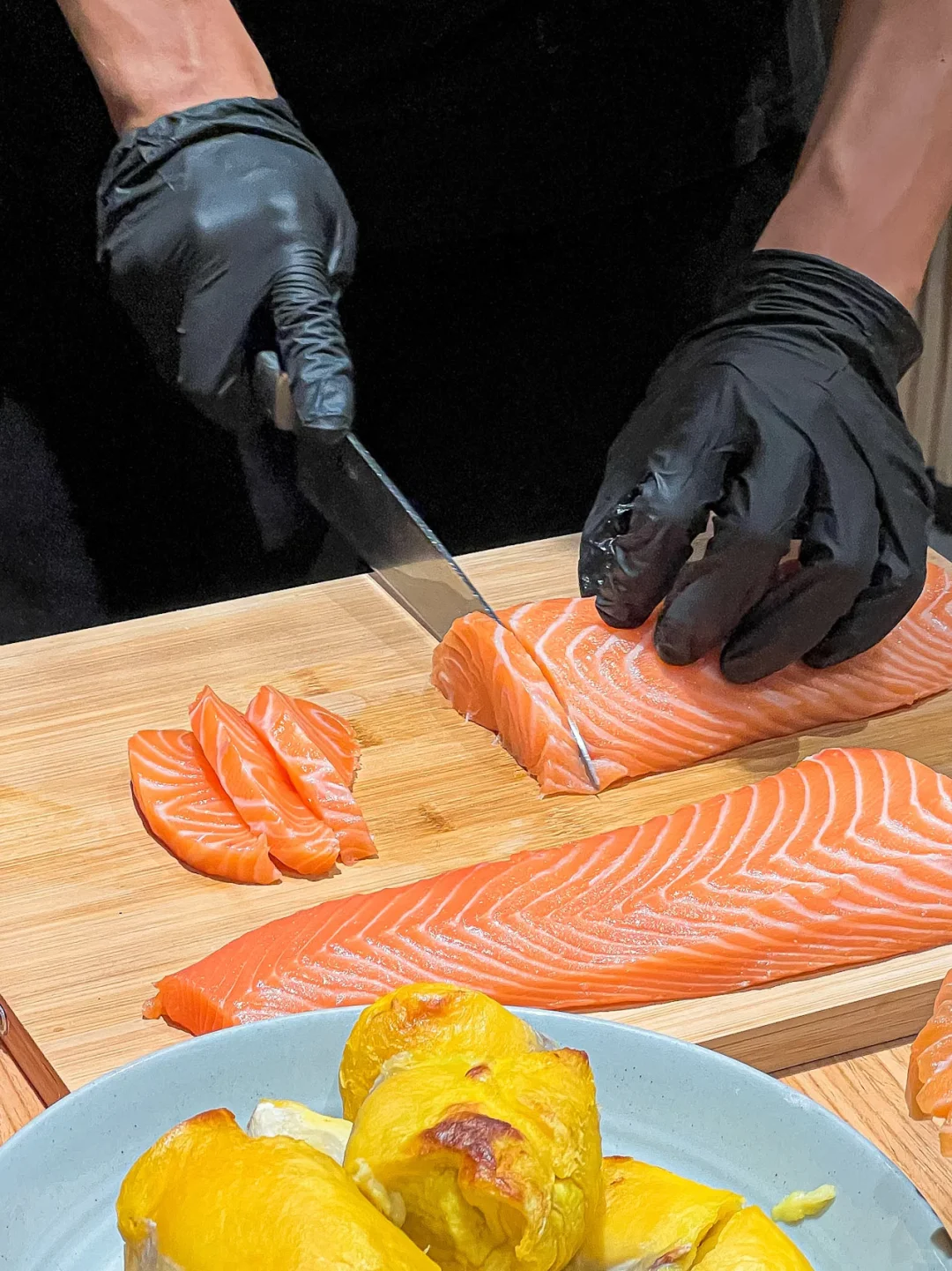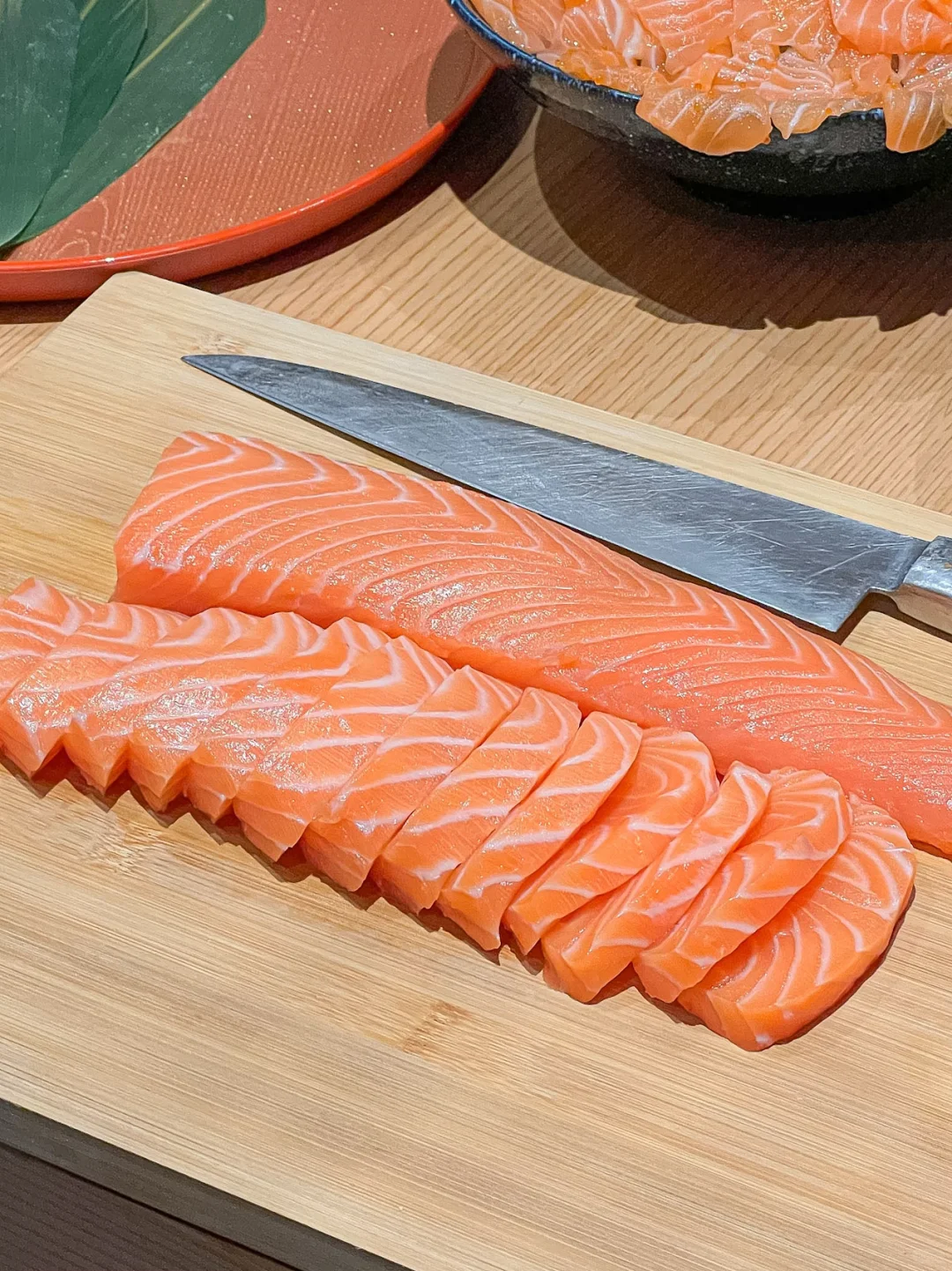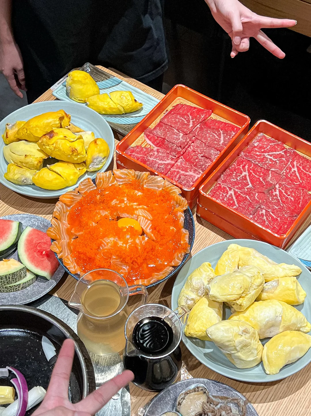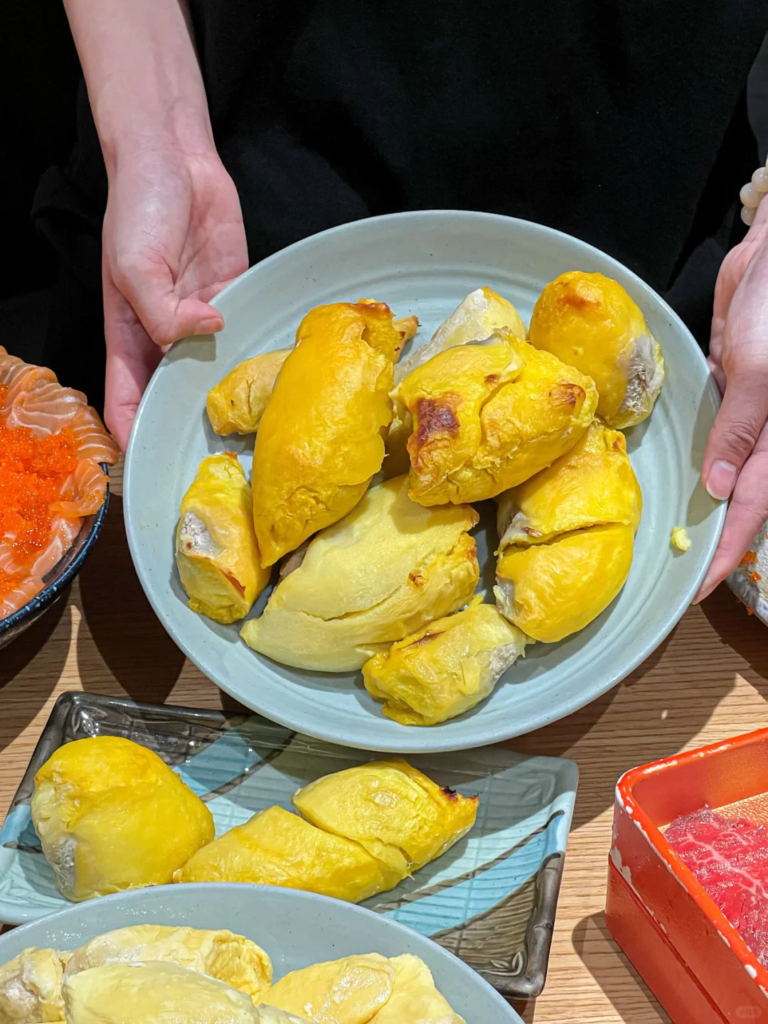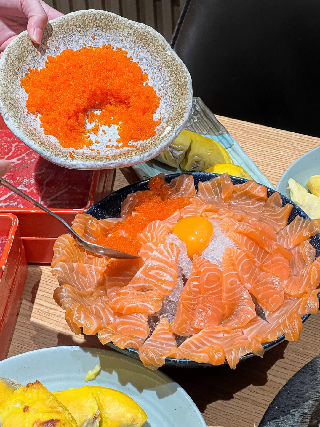 在广州和干饭搭子吃到的。。。肚子能装得下就行 现切的三文鱼加上蟹籽真的好吃到晕厥😭,吃完这顿未来几天三文鱼无感了!! 记得留些肚子放榴莲、和牛、山姆甜品、寿喜锅这些都是任吃的,又是肚子饱饱的一顿