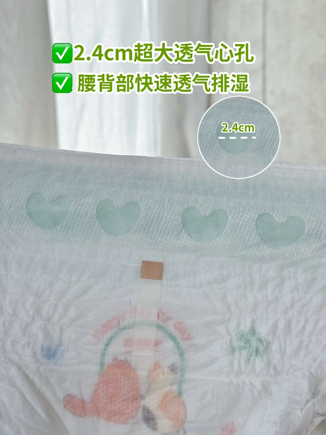 它跟妈妈们之前手动剪洞的理念一样!就是为了透气!我第一次见到自带大开孔的设计,腰间有四个2.4cm的超大透气巨心,除了颜值高高,透气也不在话下,三秒钟就能快 速的排除闷湿,即使秋冬穿着厚重的衣服也不怕闷出红pp了。