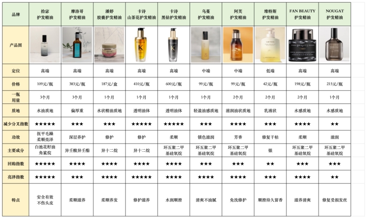 (下图展示了部分经过实际评测的护发精油产品)
