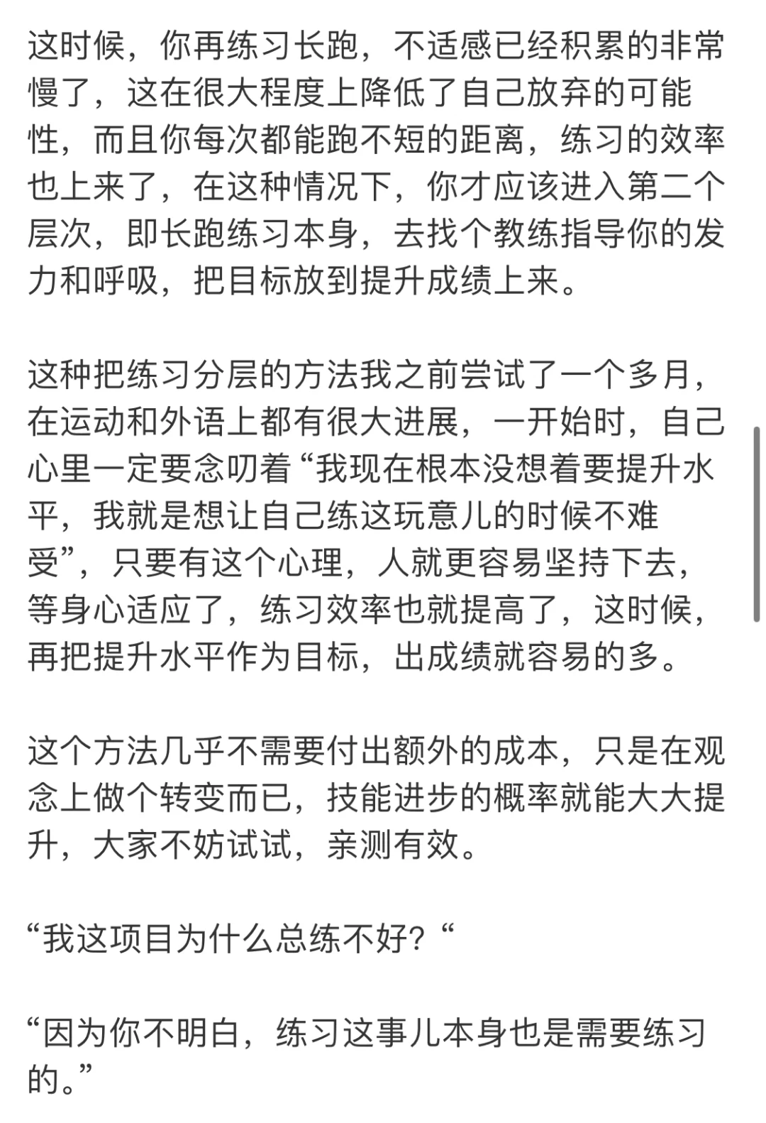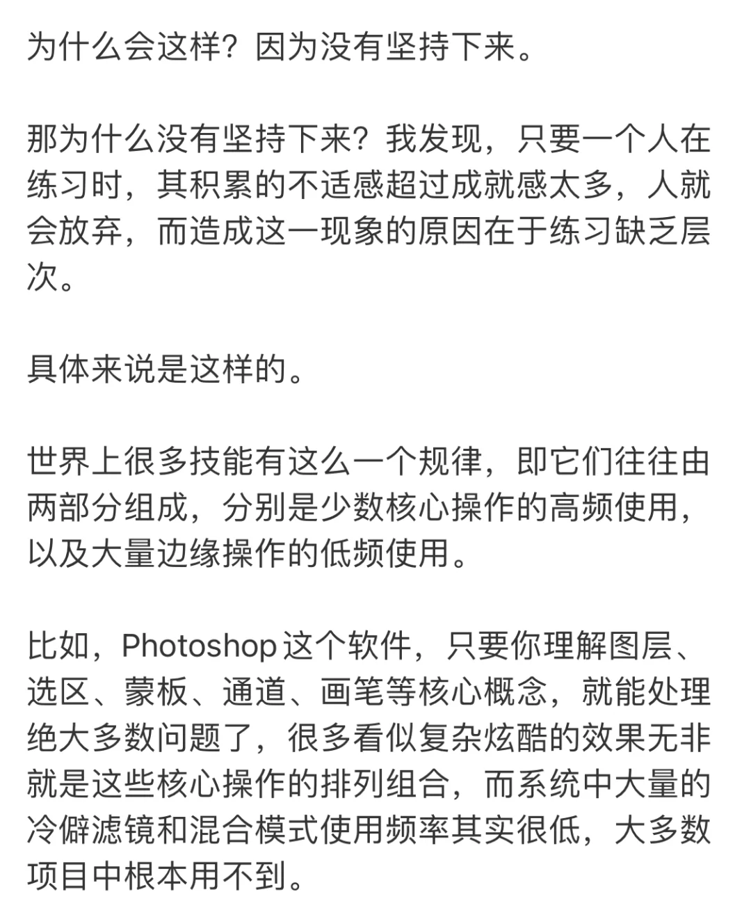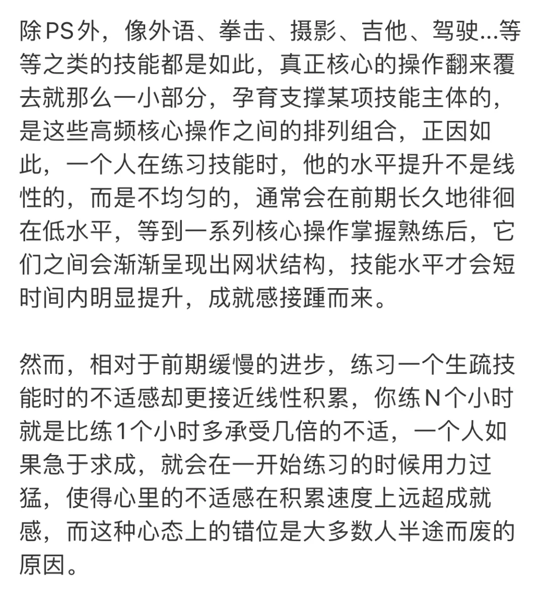 对于很多技能来说,进步的第一步应该是忘记进步,因为大部分技能水平在提升时,速度都不是线性的,如果一上来抱着迫切的功利心开始练习,很容易半途而废。