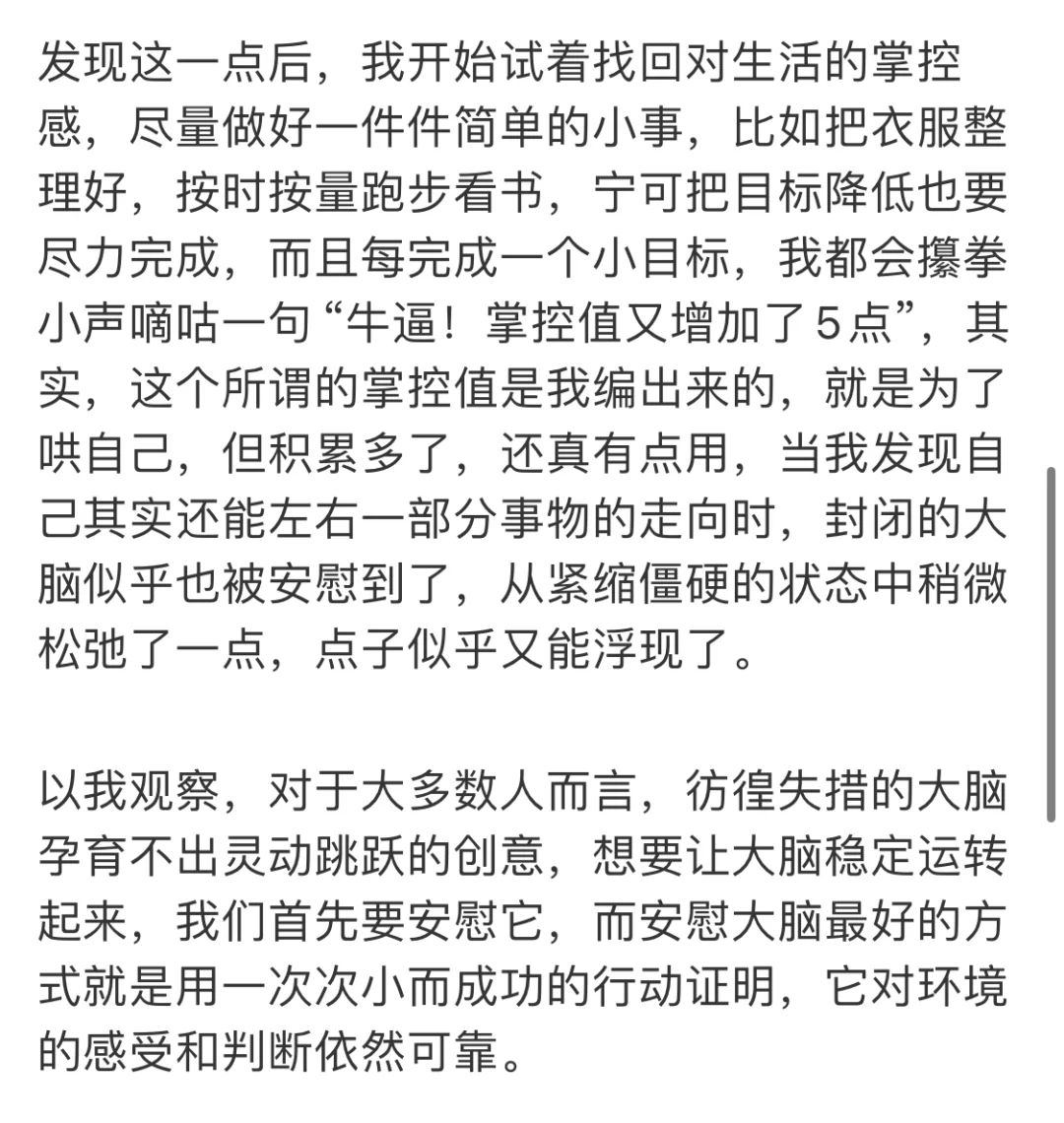 人学会自洽,不是所有事情都在自己掌控之内的,也要接受任何一切的发生,接受自己失去暂时对生活的掌控,努力去做一些小事情,让它慢慢变好