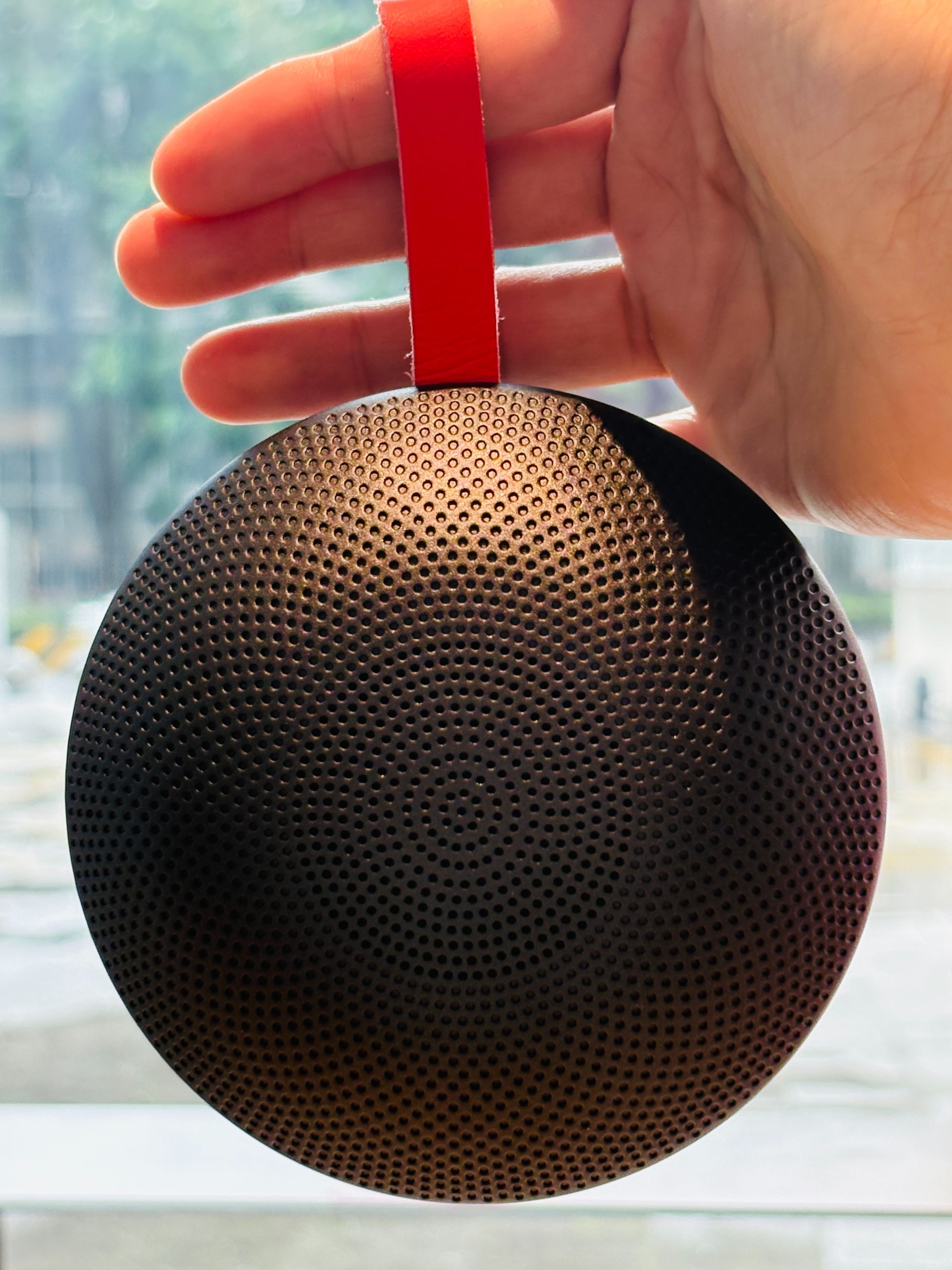 西圣SN01具有IPX4防水设计,譬如有些人喜欢泡澡时听听音乐,或者户外使用时突然下雨,有了防水设计就能大胆放心使用。远看西圣SN01,外观如同镂空状的飞碟,但也仅是一个网状镂空设计效果,实际上只有顶部才是开孔。整体重量仅有229克,尺寸一手掌能掌握,内嵌一体式挂绳,可手提也可挂在书包上,没有负重感,轻松出行。