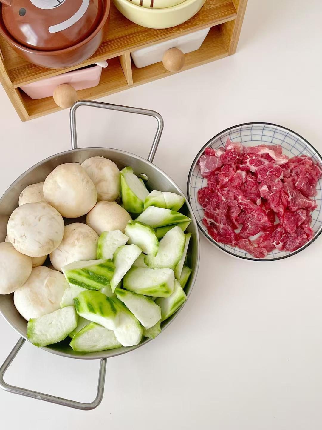 食材:牛肉、丝瓜、口蘑、淀粉、胡椒粉。