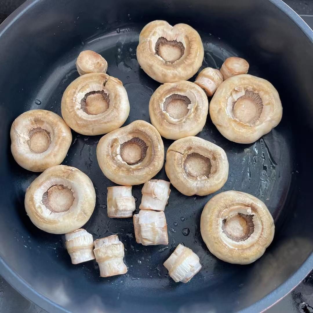 起锅烧油,油热后倒入口蘑两面煎一煎,剪成小块。炒软后加入丝瓜和适量清水煮开。