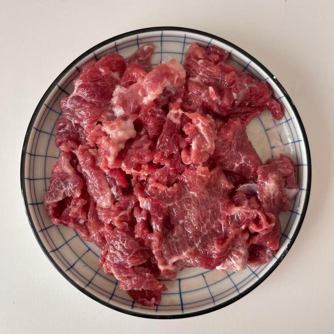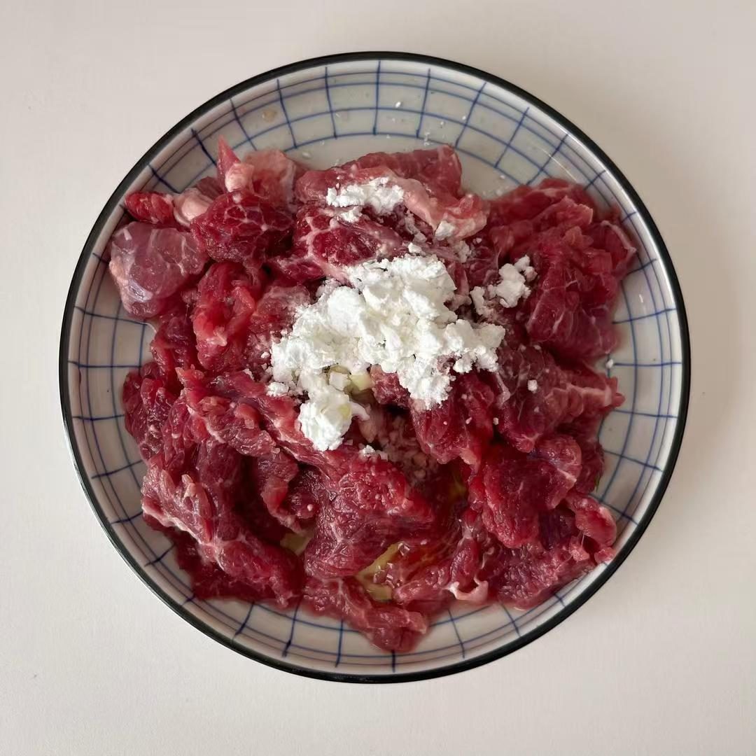 牛肉清洗干净切成片,加入淀粉和食用油,抓拌均匀腌制十分钟。