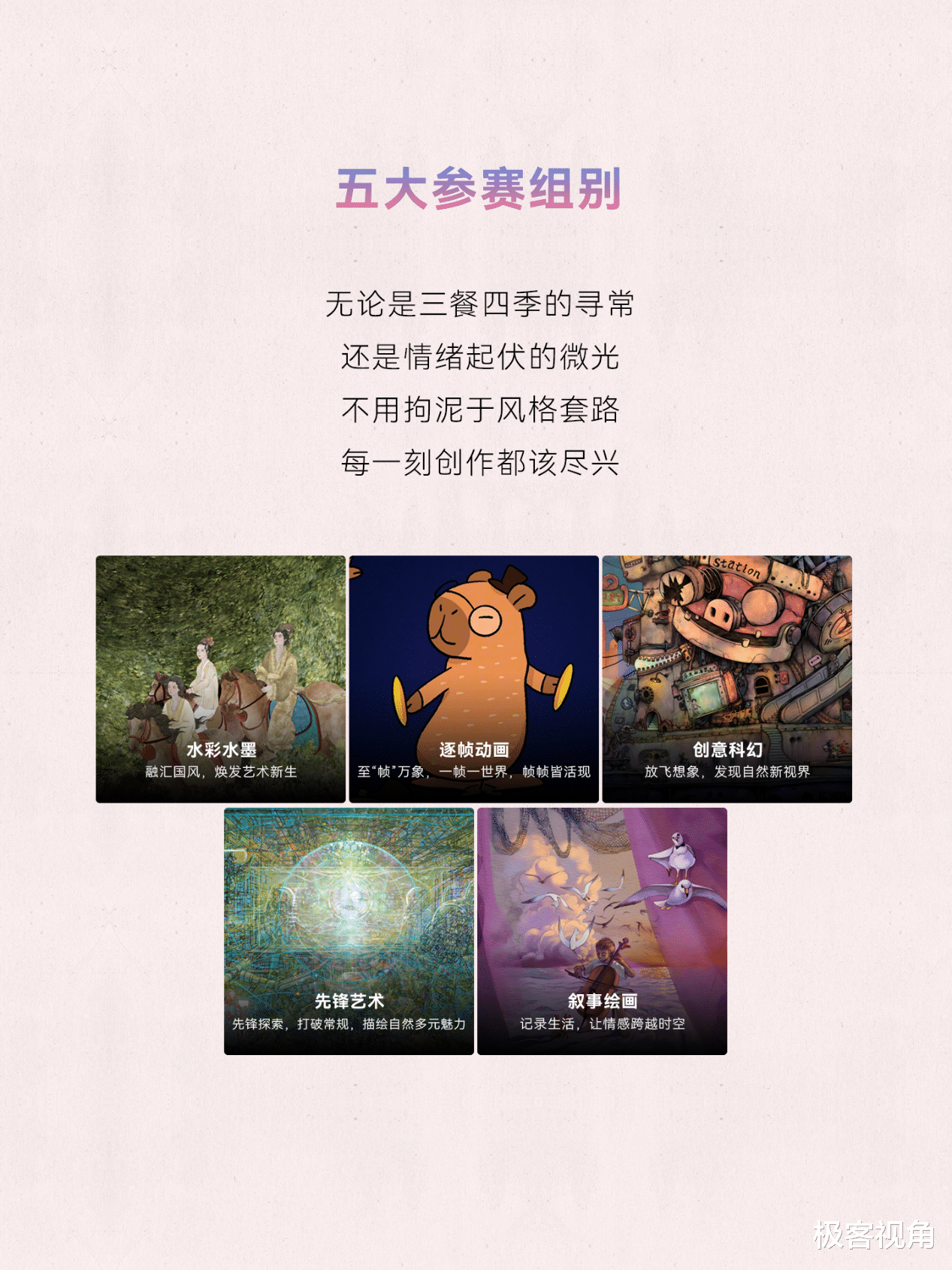 如果你也被这份创意所感染,那么这场面向所有人的艺术盛事,正是你施展才华的最佳舞台。本届大赛在延续往届高水准的基础上,为创作者提供了更广阔的创作空间和更多元化的表达渠道。大赛设置了五大专业赛道,除了深受数字艺术爱好者喜爱的叙事绘画、水彩水墨、创意科幻、先锋艺术四大组别,今年更是紧随创作趋势,首次增设了「逐帧动画」赛道,鼓励创作者探索动态视觉的无限可能。