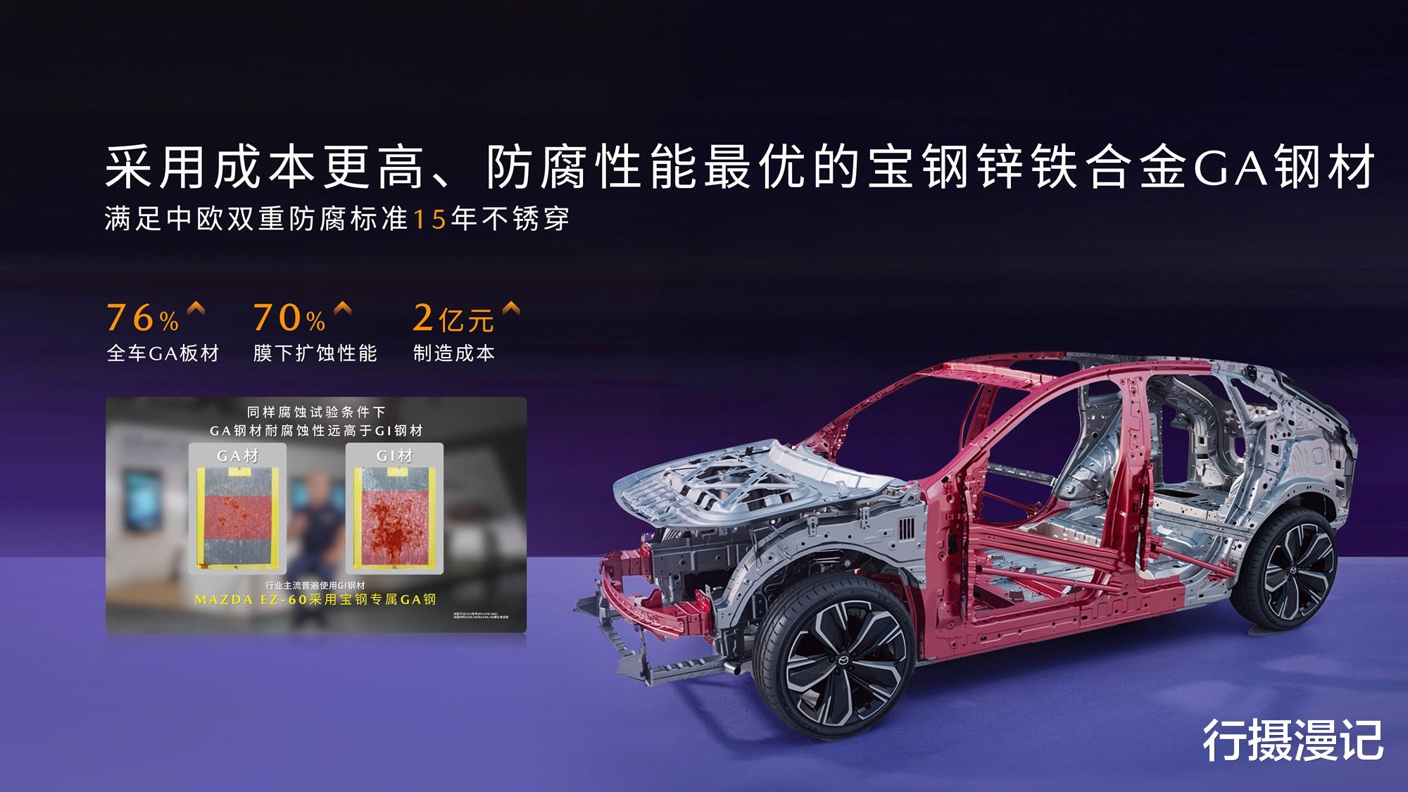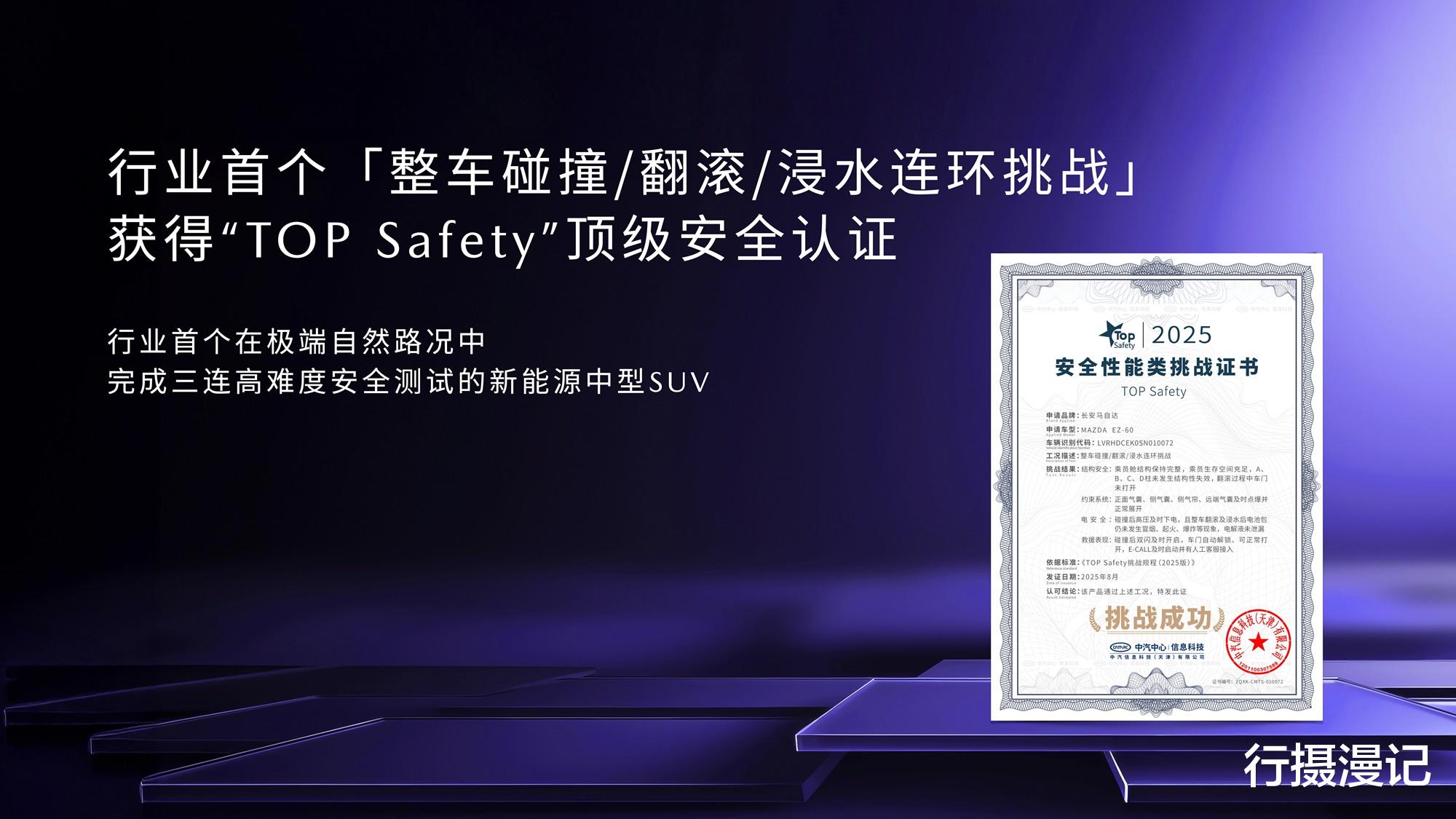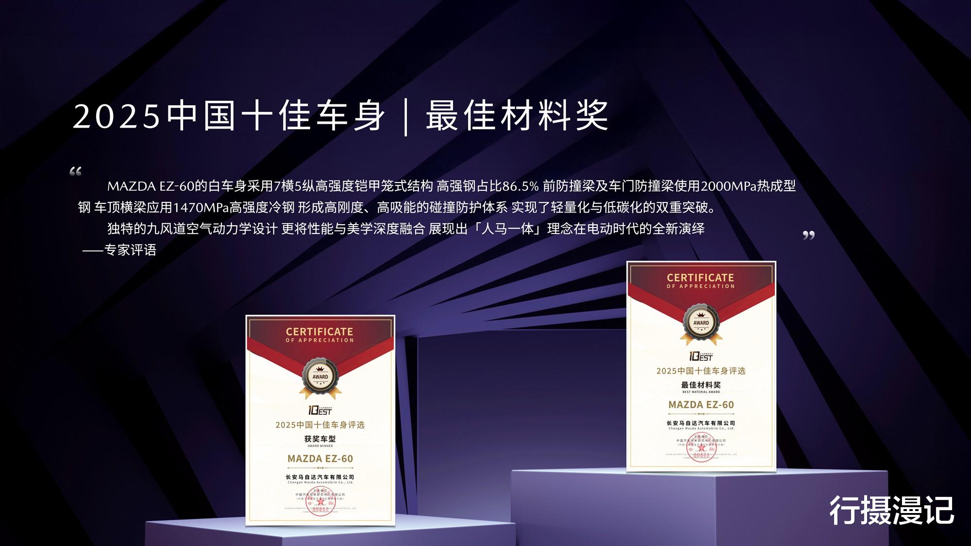 安全是马自达刻在骨子里的DNA。EZ-60通过了“实战测试+权威认证”双维度,在丙察察成功完成行业首个“整车碰撞/翻滚/浸水”连环挑战,并荣获中汽中心颁发的“TOP Safety”顶级安全证书,展现出卓越的安全性能。同月再次斩获“2025中国十佳车身”及“最佳材料奖”两项大奖。7横5纵的笼式铠甲结构,高强钢占比86.5%,热成形钢27.45%,最高强度2000MPa,全车1500MPa及以上超高强度零件集群50个。A柱采用五重防护结构,内外双层1500MPa热成型钢和腔体SNS复合材料,大幅增强A柱的钣金强度和刚度,抗弯性能提升44%。