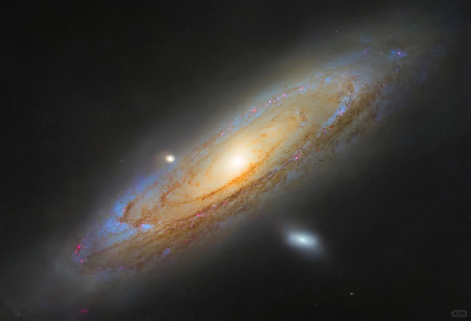 当我们透过望远镜长时间曝光拍摄仙女座大星系时,可以看到它那美丽的螺旋结构,通过Ha窄带滤镜还能展示出丰富的发射星云(小红花)。这个巨大的星系正在慢慢靠近银河系,并将于40亿年后与银河系相撞,那时将合并成一个新的椭圆星系。