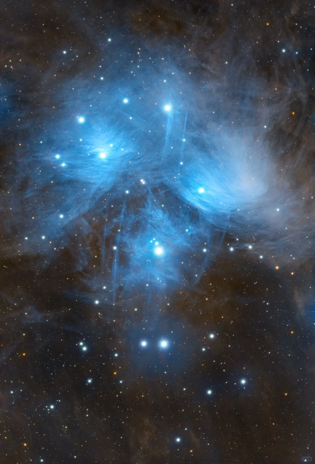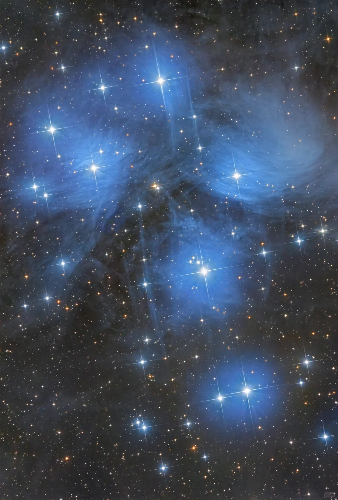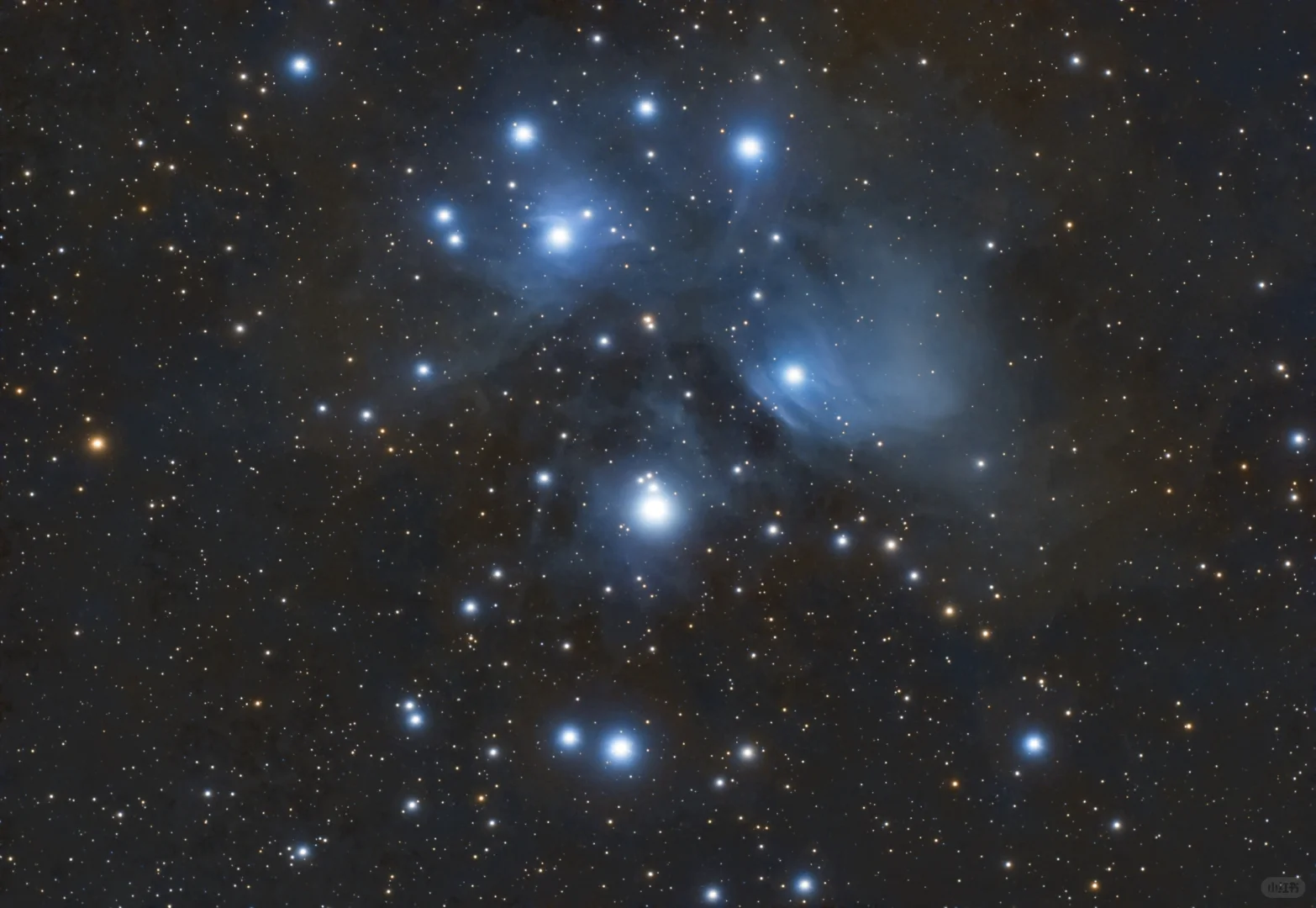 位于金牛座的M45昴星团(七姐妹星团)作为全天最大最亮的疏散星团,一直是所有天文摄影爱好者必拍的目标。这个璀璨的疏散星团即使是在市中心也能清晰地看到。