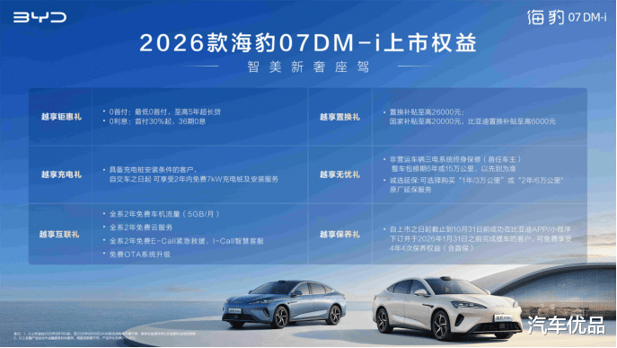 9月15日,智美新奢座驾——2026款海豹07DM-i正式上市,新车共推出4个配置版本,官方指导价格为14.98万元-18.68万元,并推出越享钜惠礼、越享置换礼等六重购车礼遇。2026款海豹07DM-i在“智能、舒适、性能、颜值、安全”五大维度全面进阶,基于全新一代插混整车平台打造,新增云辇-C 智能阻尼车身控制系统、TSC高速爆胎稳定控制系统及天神之眼 B - 辅助驾驶激光版(DiPilot 300)等硬核黑科技,为用户带来高品质出行新体验。