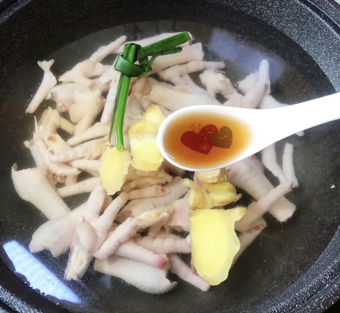 冷水下锅,下入鸡爪,放1小勺盐,2勺料酒,一颗葱,几片姜片去腥。大火烧开沸腾后煮12分钟