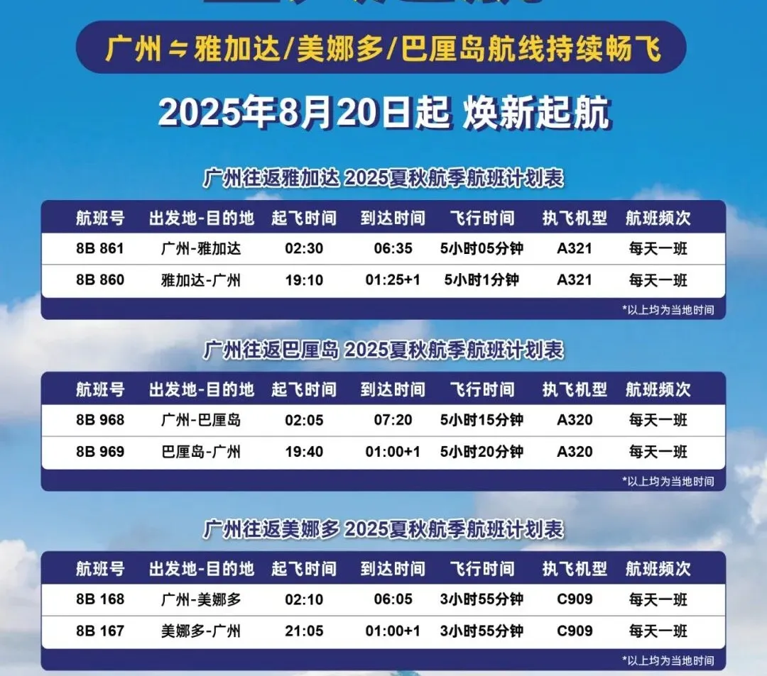 图:广州至雅加达、巴厘岛、美娜多航班时刻表
