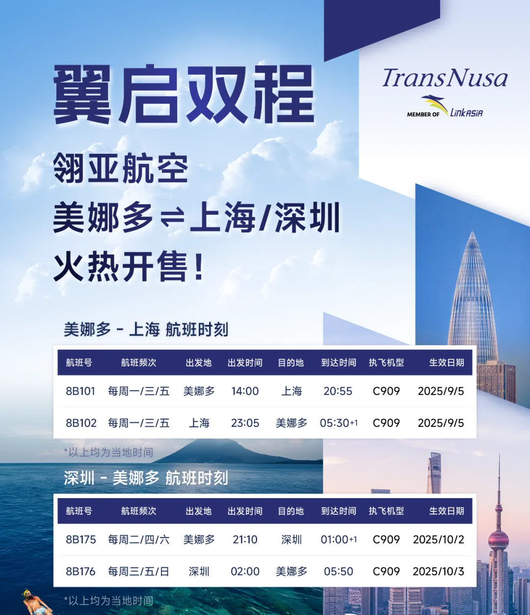 2025年9月4日,印尼翎亚航空(TransNusa)在上海举办推介会,这也是近期继广州、深圳之后的第三场推介活动,重点推介上海-美娜多定期航线以及通过美娜多至印尼多个目的地航线网络以及旅游资源。