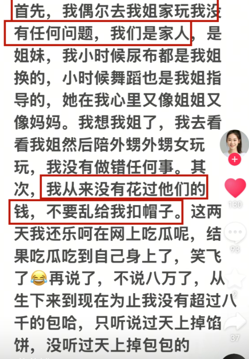 关于“花费8万元购买奢侈品”的传言,她强调从未购买超过8000元的包款,也未曾动用姐姐和姐夫的资金。