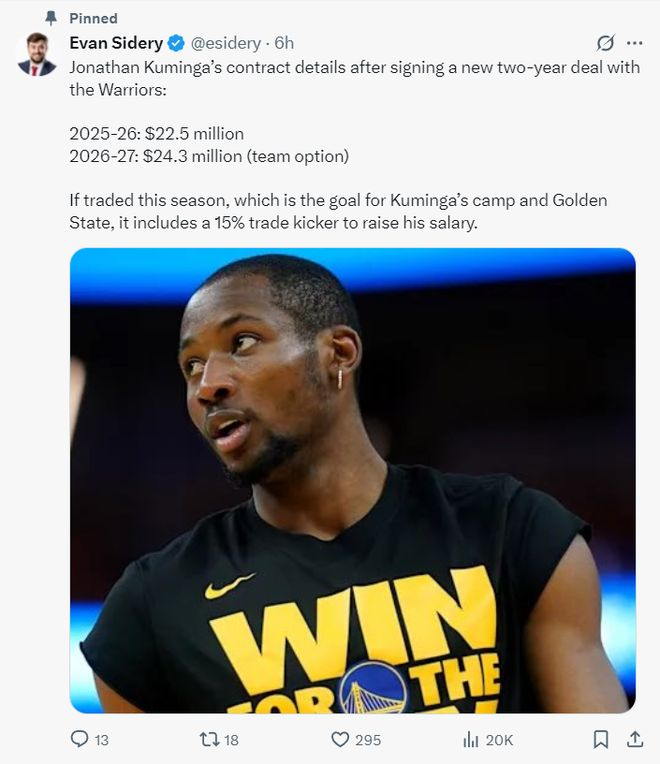 最终,库明加和他的经纪人达成了协议。他们已经公开表示,如果勇士队不增加他们两年的报价,或者在第二年让球员有选择权,他们将考虑勇士队的报价。然后,在10月1日的截止日期即将到来之际,库明加和他的经纪人接受了勇士队的报价:两年,4680万美元,第二年有球队选项。这份合同使库明加成为一笔交易目标(他无法控制自己被交易到哪里)。