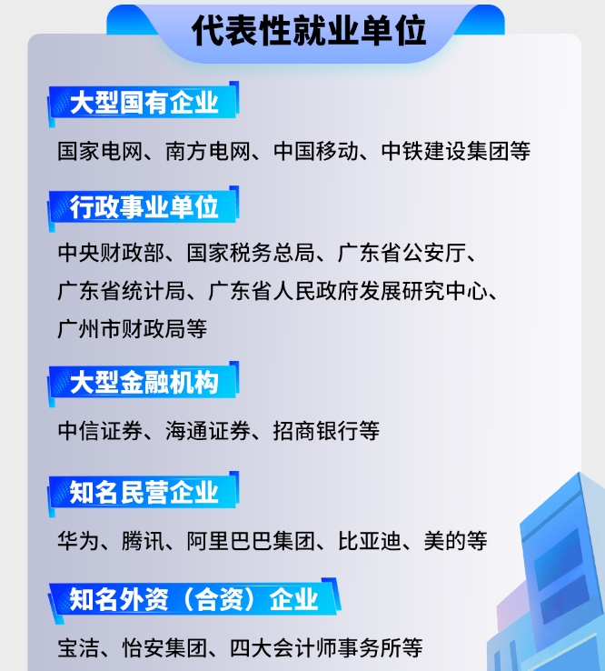 即便是选择直接就业,毕业生的就业单位也很优质,大型国有企业有国家电网、南方电网、中国移动、中铁建设集团等,行政事业单位涵盖中央财政部、国家税务总局等,大型金融机构包括中信证券、海通证券、招商银行等,知名民营企业有华为、腾讯、阿里巴巴集团、比亚迪、美的等,知名外资(合资)企业有宝洁、怡安集团、四大会计师事务所等。