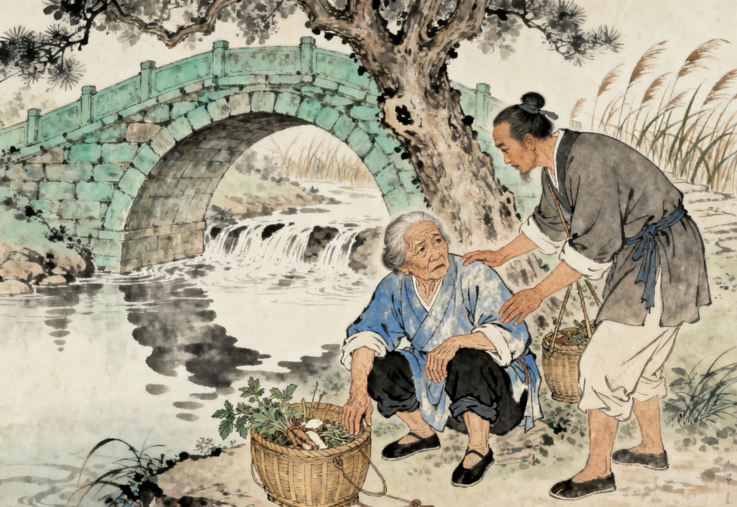 入秋的一天,陈阿福挑着担往清溪村走,刚过石拱桥,就见路边蹲着个老妇。老妇穿件洗得发白的蓝布衫,面前放着个竹筐,里面是刚采的草药,可她腰弯得厉害,手撑着膝盖,半天站不起来。陈阿福赶紧放下货担,上前扶她:“婆婆,您这是咋了?”