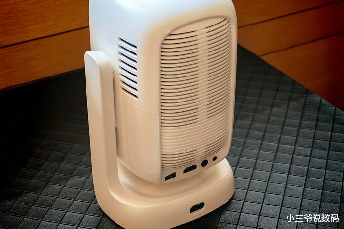 投影背部下方从左至右依次是USB2.0接口、HDMI接口和3.5mm音频接口,而电源键和充电接口则设计在了云台支架上,这样的设计更加简洁美观,不会因为接线太多造成杂乱,而且在我们调节角度时,电源线也不会随机身而转动,避免了电源线松动的隐患。