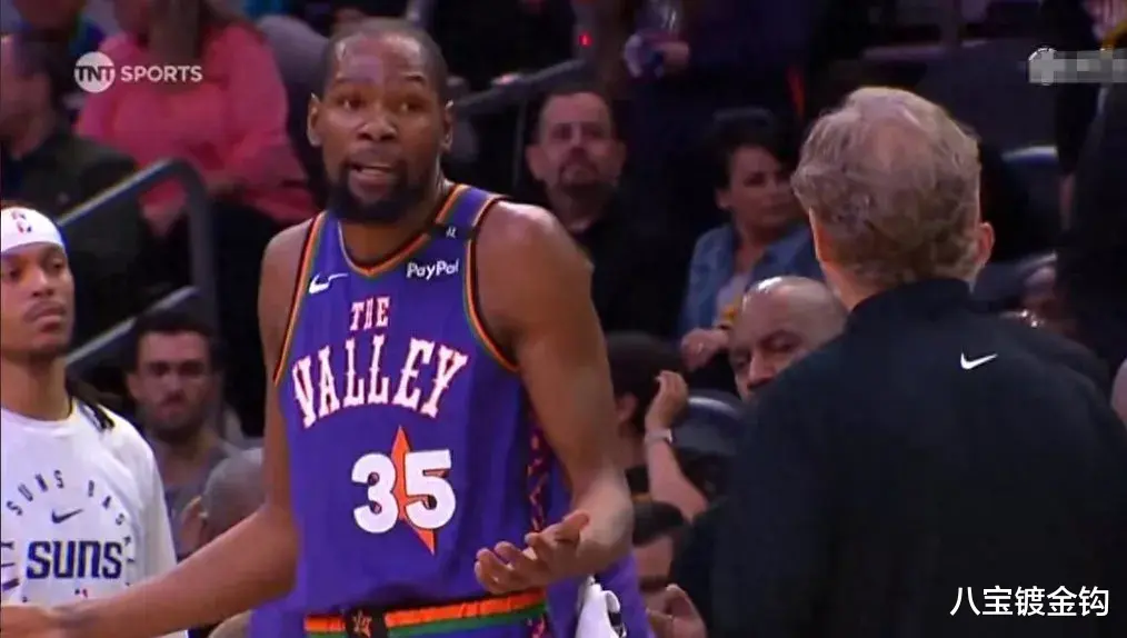 布登霍尔泽摇着头,还在试图与杜兰特沟通,但后者已经完全陷入暴怒状态,张开双臂不停地抱怨着什么。