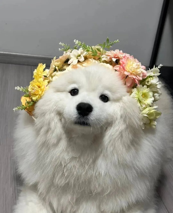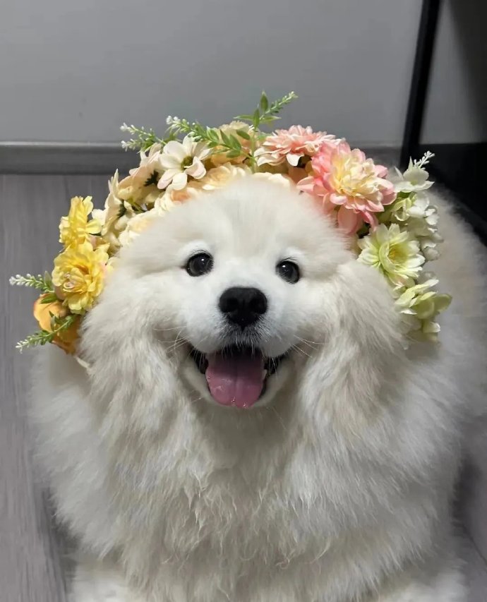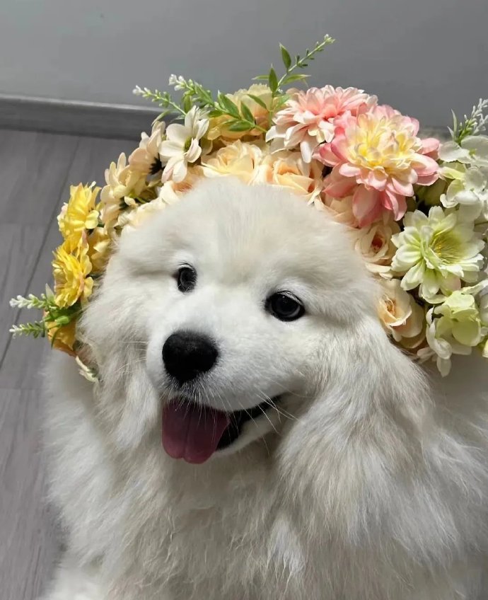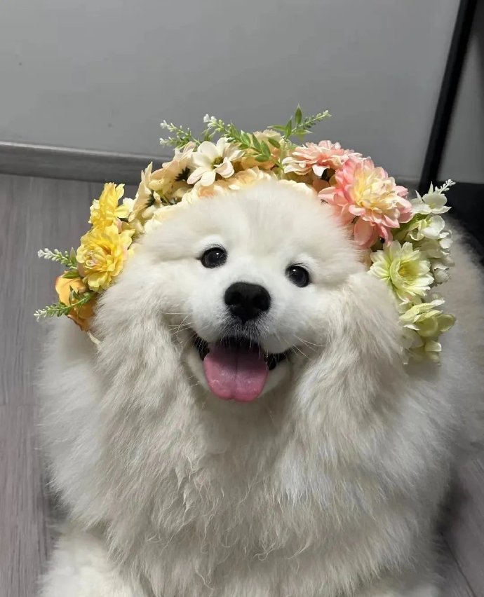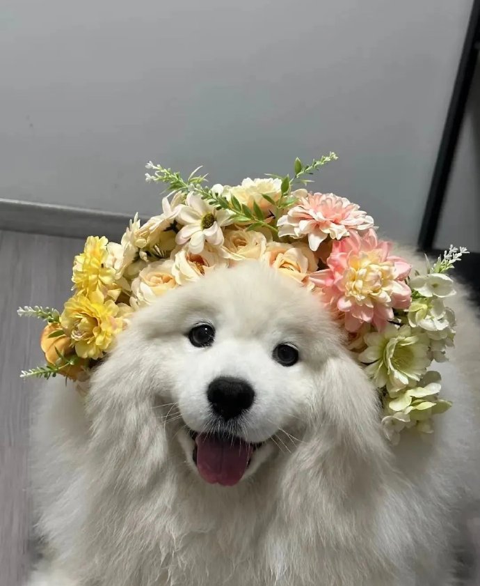给萨摩耶戴上簪花[烟花],秒变小仙女,美得不像样 它好像也知道自己很漂亮,笑得嘴都合不拢了,自恋型小狗哈哈