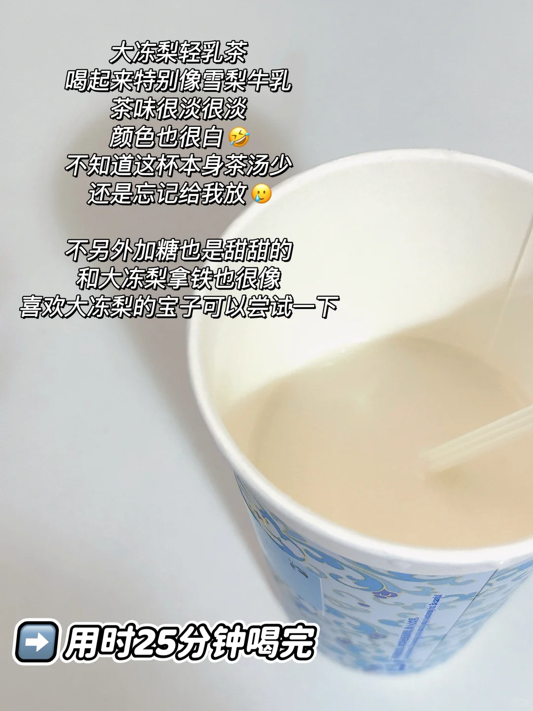 大冻梨轻乳茶,喝起来特别像雪梨牛乳,茶味很淡很淡,颜色也很白🤣不知道这杯本身茶汤少,还是忘记给我放🥲