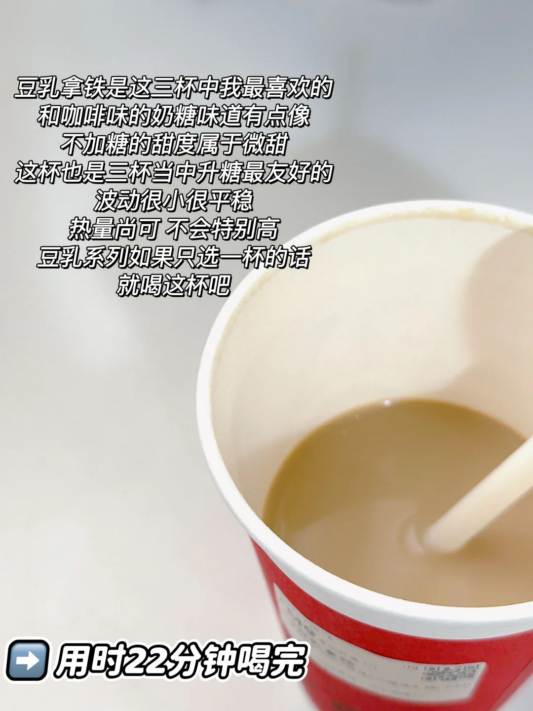 豆乳拿铁是这三杯中我最喜欢的,和咖啡味的奶糖味道有点像[大笑R]不加糖的甜度属于微甜,这杯也是三杯当中升糖最友好的,波动很小很平稳,热量尚可,不会特别高,豆乳系列如果只选一杯的话就喝这杯吧[得意R]