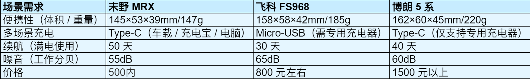 五、横向对比:多场景下的「性价比碾压」从对比可见,MRX 在「多场景适配性」上优势明显 —— 更小的体积、更通用的充电方式、更长的续航,价格却远低于国际品牌,尤其适合需要在家庭、汽车、商旅、办公室之间切换的用户。