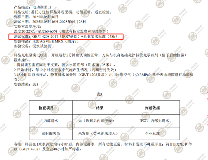 专业机构检测表明:未野剃须刀48小时全机身浸泡无进水