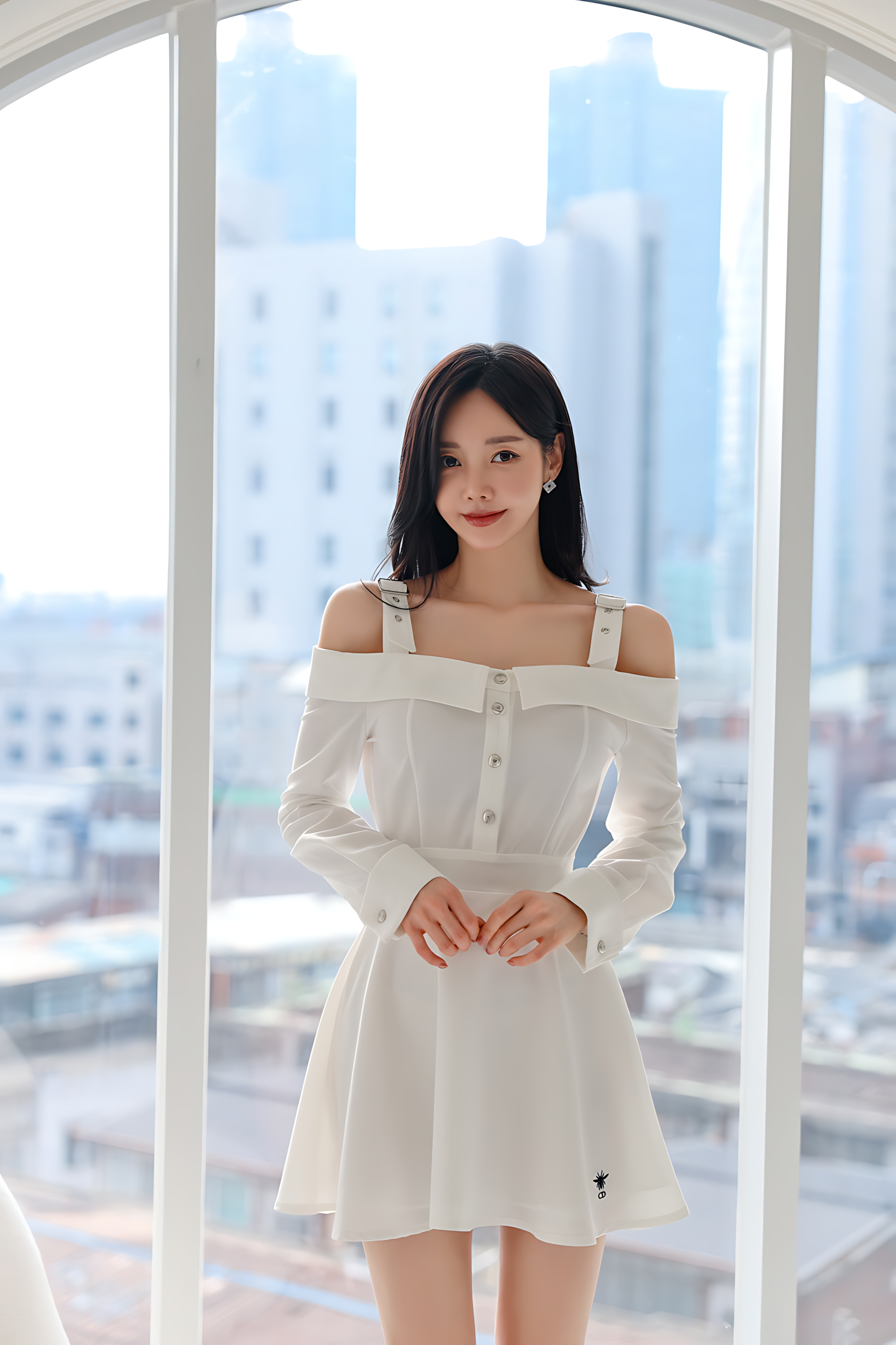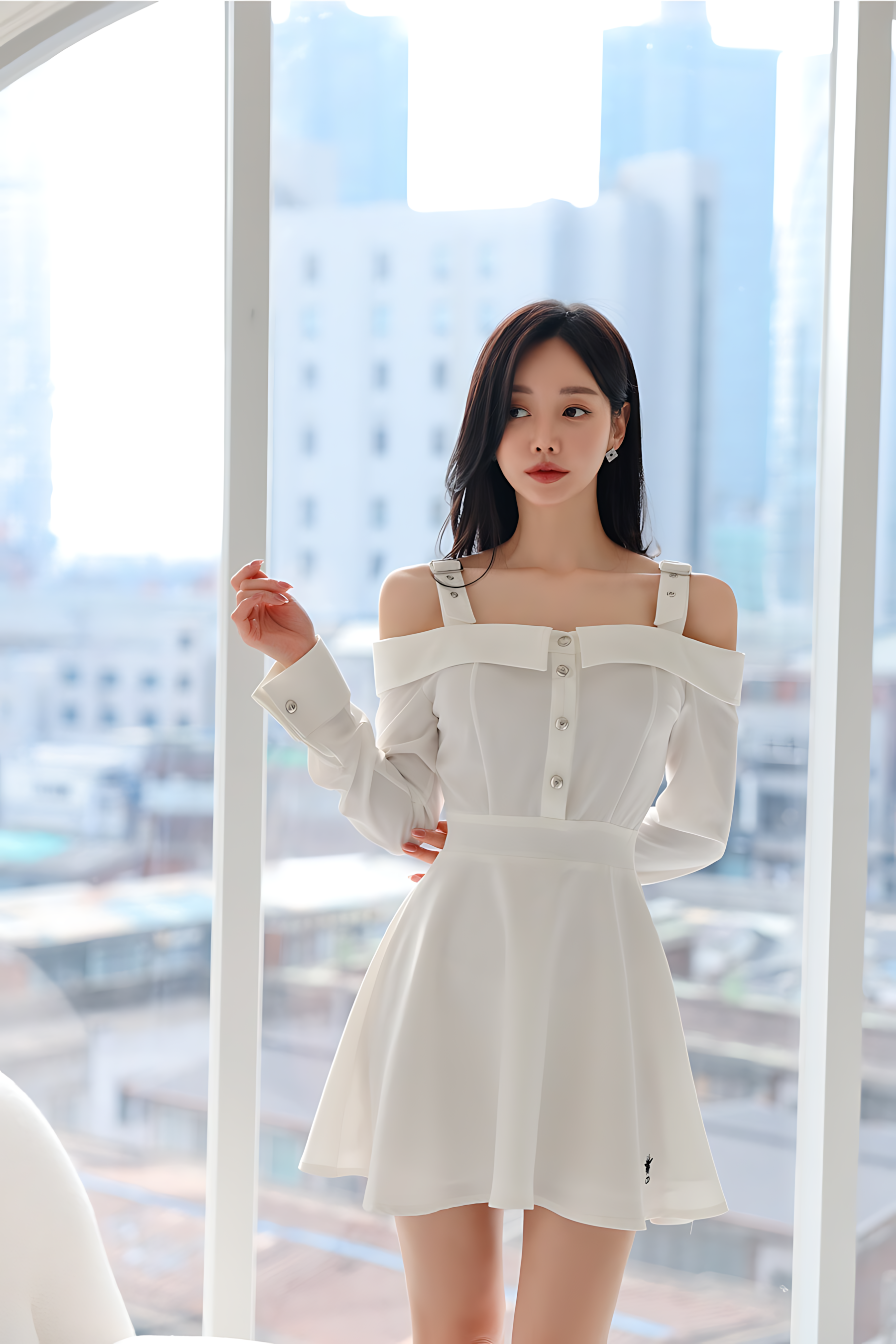 她身着一袭白色露肩连衣裙,尽显优雅气质。这款连衣裙为长袖设计,露肩的款式露出精致的锁骨和优美的肩线,增添了几分性感与妩媚。肩部有两条白色的肩带装饰,肩带上有纽扣点缀,既起到了装饰作用,又为整体造型增添了一丝复古与时尚感。