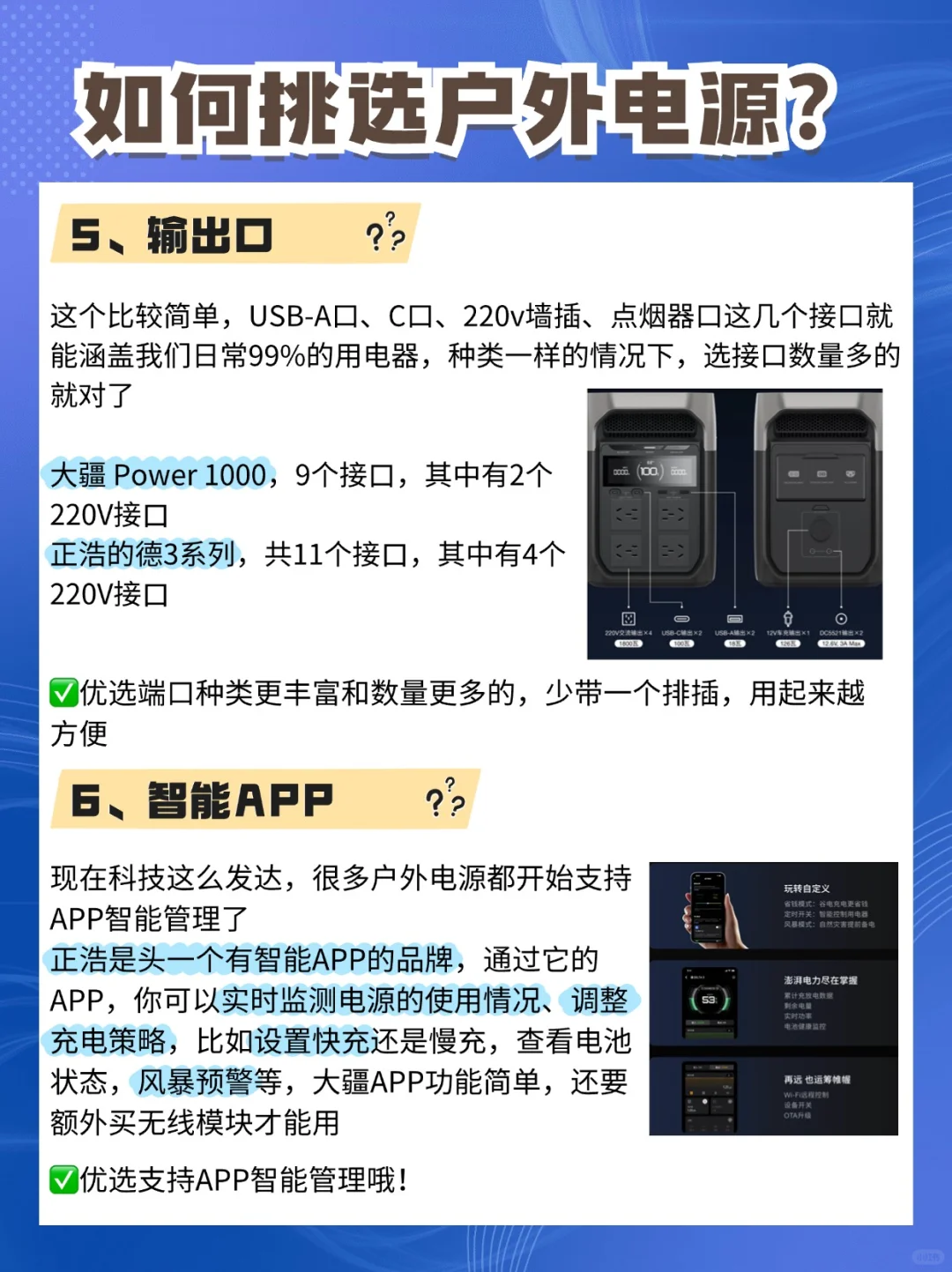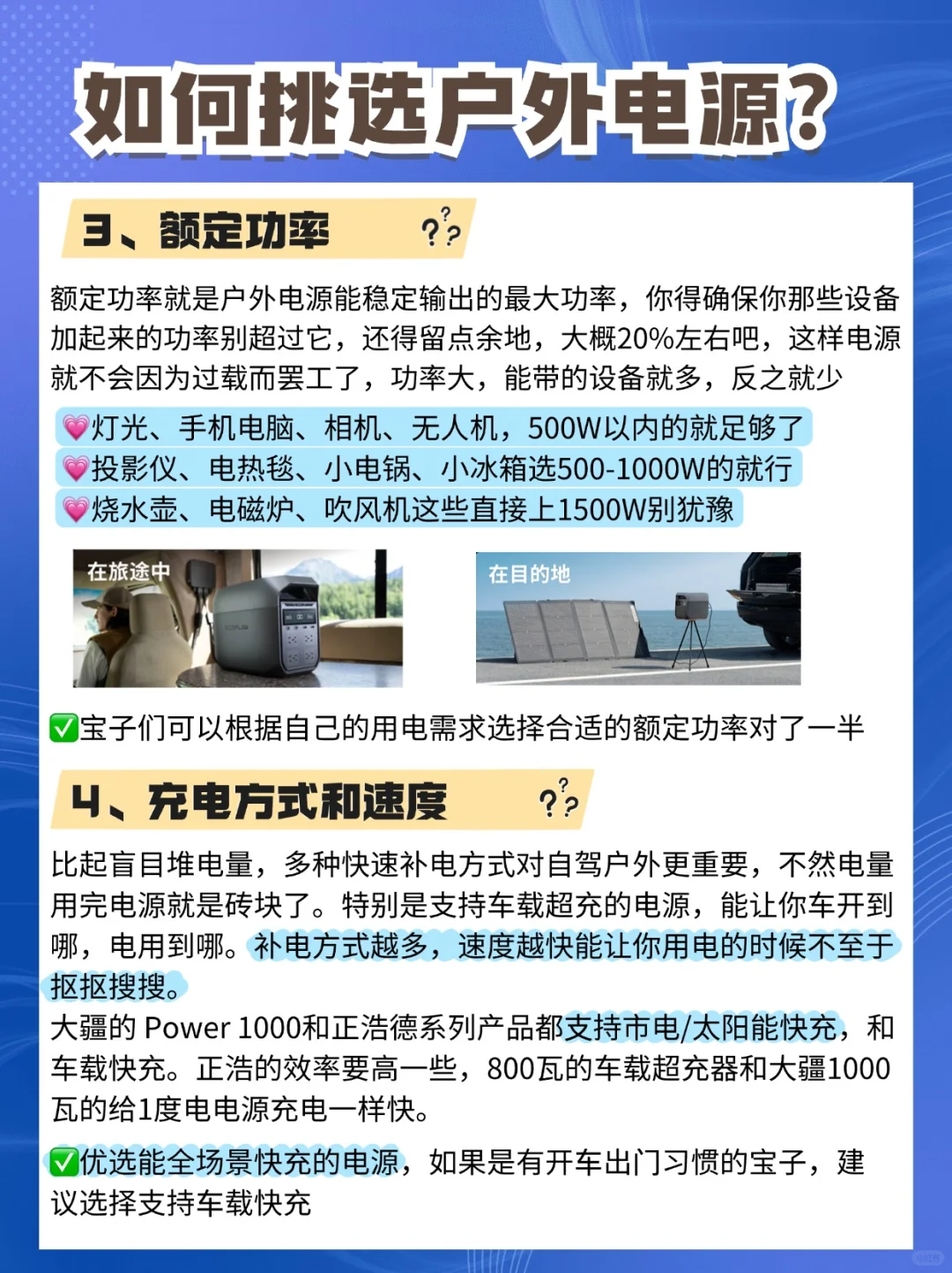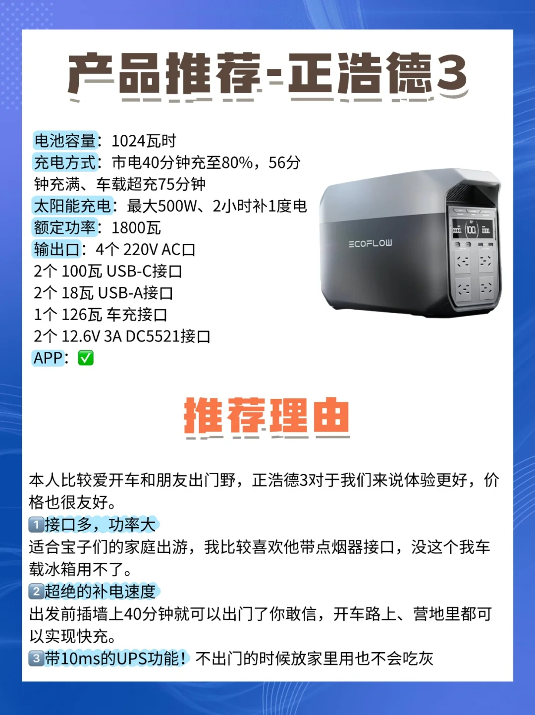 这几年户外、自驾和露营真是太火了,基本上只要你想开车自驾或者露营,电源就是刚需。 今天,我就来跟大家聊聊怎么选户外电源❓还挑选了市面上比较火的[三R]款户外电源来为大家做测评❗️ 选户外电源啊,咱们得关注这几个点: 品牌、电池容量、额定功率、充电方式和速度、输出方式,还有智能化,这些都是关键哦❗️ 选对好品牌,就选对了50%。知名品牌如正浩、大疆等,通常在产品质量、性能、售后服务等方面有更高的保障。专业品牌的产品经过了市场的检验,用户口碑较好,往往产品力都属于第一梯队。 正浩,全球市场份额Top1,在行业的统治地位可见一斑。 [一R]正浩德3 性价比款,强烈推荐!兼顾了高性能和价格,正浩的产品一如既往贴心地为我们这些自驾、户外玩家考虑,多接口简直就是汽车绝佳的1度电拓展坞。 不需要额外花钱就能享受满配性能。如果户外下大雨,就冲电池包这么高的防护等级,也不在怕。外观要是和Plus一样就更好了。 [二R]正浩德3的华丽升级版——正浩德3 Plus 颜值党和直流充电党必备。非常亮眼的电光银色,不管是什么颜色的车都很搭。USB-C口功率提到140瓦,笔记本和无人机都能大功率充电了。 如果是长期在户外、对太阳能充电有高需求,可以考虑这款。这一款估计还能和正浩上一代德2一样,上市两年无敌手,就是希望能配小灯。 [三R]大疆DJI Power 1000 毕竟是站在正浩肩膀上做出来的产品,性能和正浩差不太多,这款产品让我惊喜的亮点就是有两个无人机直流充电口(sdc接口),可惜的是点烟器接口/APP/车载超充/加电包/太阳能板等都会占用这两个接口,并且部分功能需要加钱够买才能实现。友好的价格和满配难以兼得 [派对R]总的来说,正浩德3非常的香,不管是户外自驾露营玩家,还是摄影爱好者,它都能大范围去满足大家的用电需求。[扯脸H]如果是无人机爱好者,经常开车🚗去外拍的人,其实一个无人机充电管家➕一台性价比移动电源,属实够用的❗️