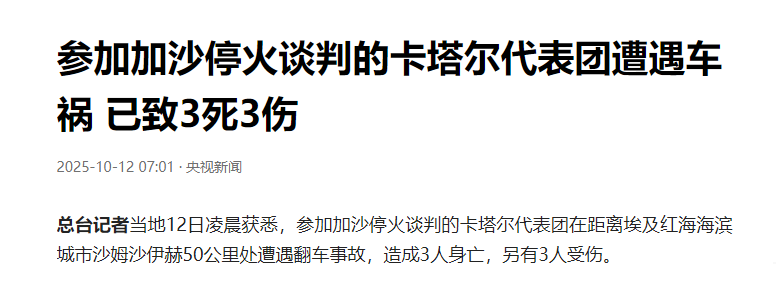 这让内塔泥巴糊看到了机会,哈马斯对付不了,对付养尊处优的中东大户绰绰有余,果不其然,参加加沙停火谈判的卡塔尔代表团在距离埃及红海海滨城市沙姆沙伊赫50公里处遭遇翻车事故,造成3人身亡,另有3人受伤,还是大意了,以为自己是他们代表,对方就不敢动手了,结果中招了。