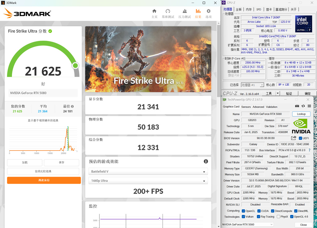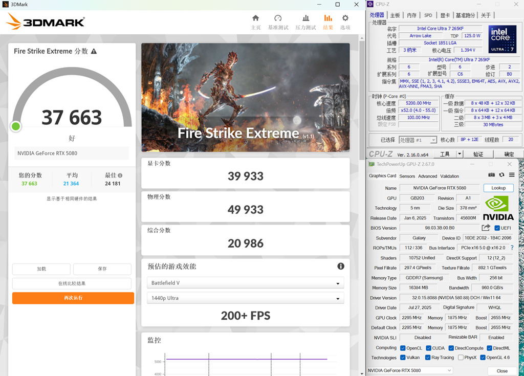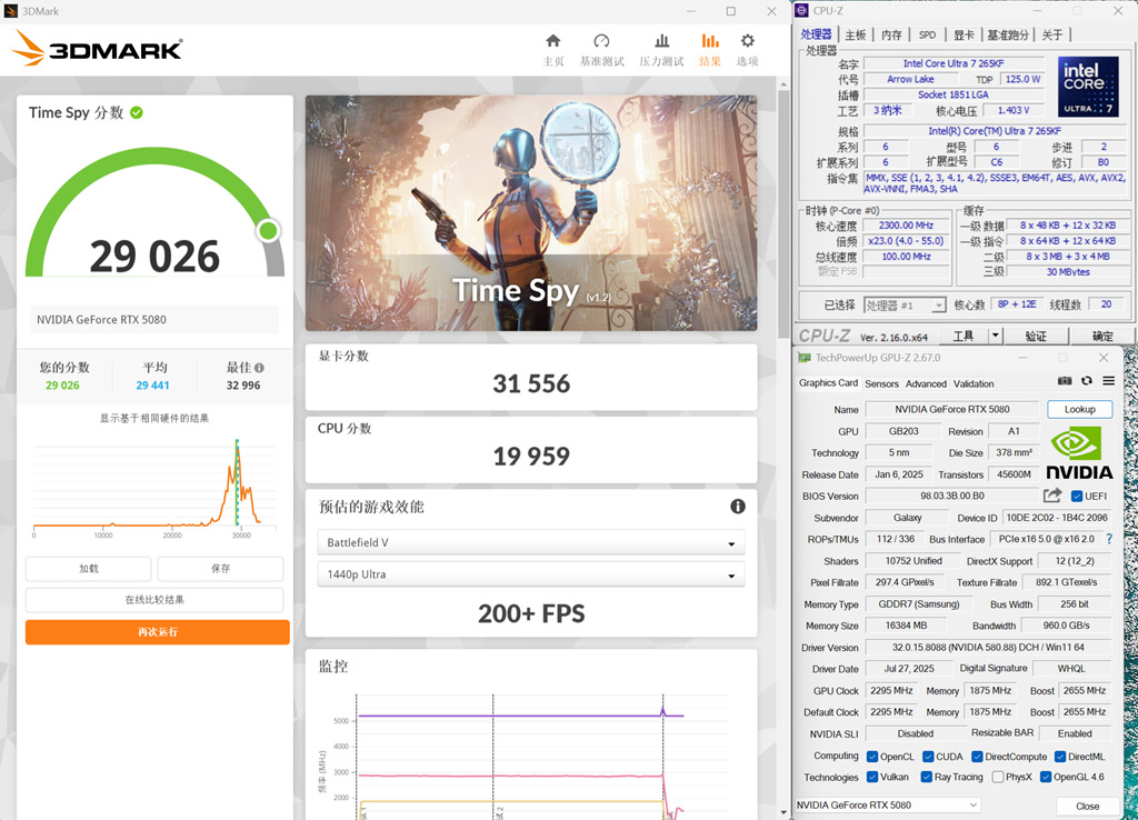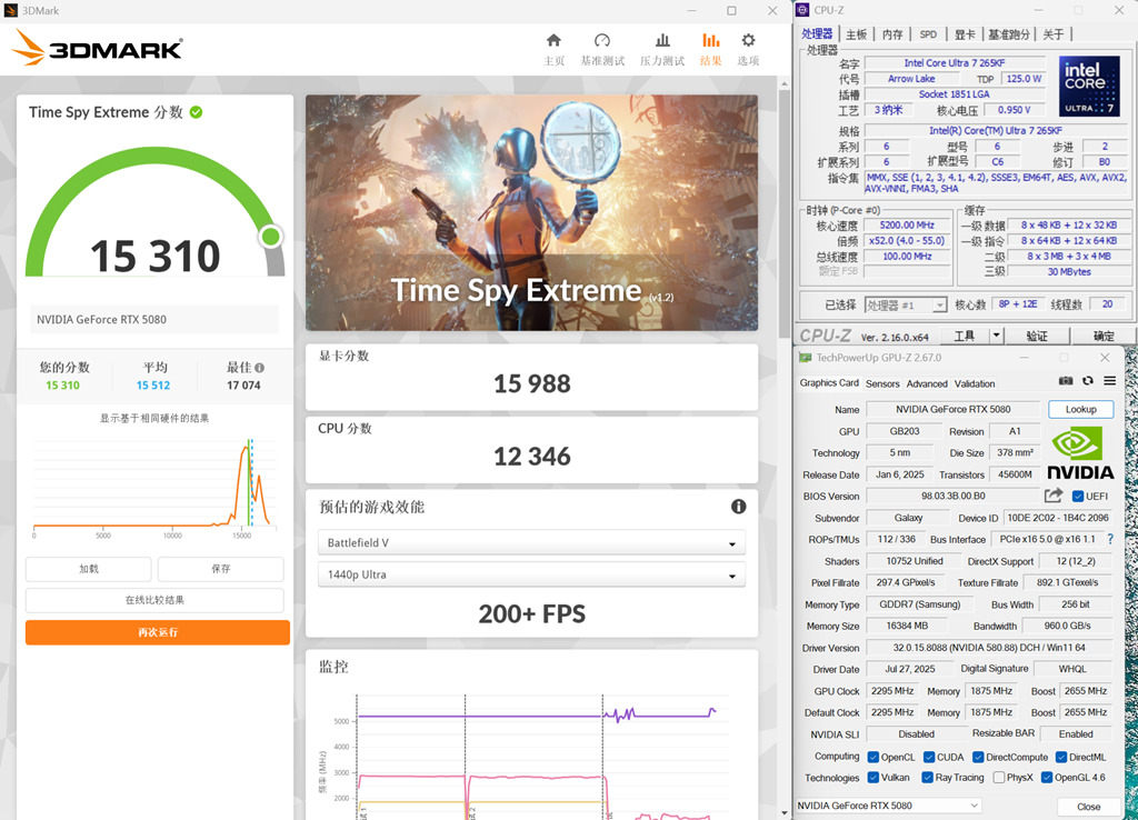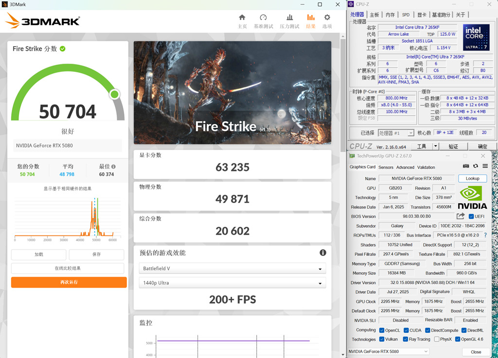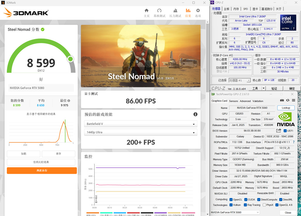 RTX5080核心为GB203架构,5nm工艺。拥有流处理器10752个,112个光栅单元,336个纹理单元,默认频率2295MHz,BOOST频率2655MHz。显卡位宽256Bit,显存为GDDR7,显存容量16GB,显存等效频率30000MHz。
