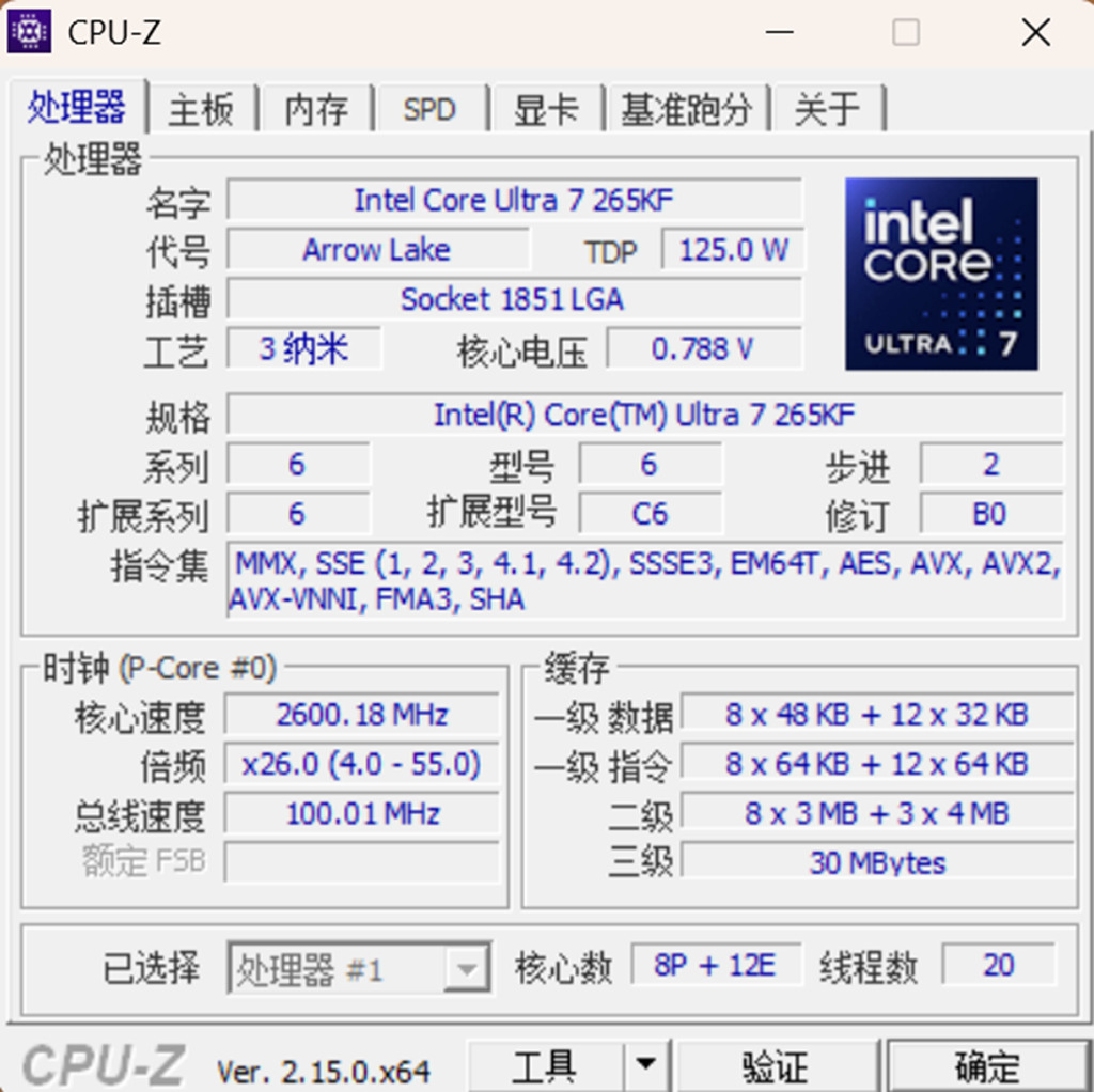 买新不买旧!英特尔酷睿Ultra 7 265KF处理器采用了Arrow Lake核心,基于 3 纳米工艺,采用 LGA 1851 插槽,三级缓存 30MB,热设计功耗(TDP)为125W,最大加速功耗(MTP)为250W。基础频率方面,性能核 3.9GHz,能效核 3.3GHz,最高睿频达 5.7GHz。CPU架构为20核20线程,有8个性能核(P-Core)基于 Lion Cove 微架构,12个能效核(E-Core)基于 Skymont 微架构,核心布局为交替排布以优化散热。